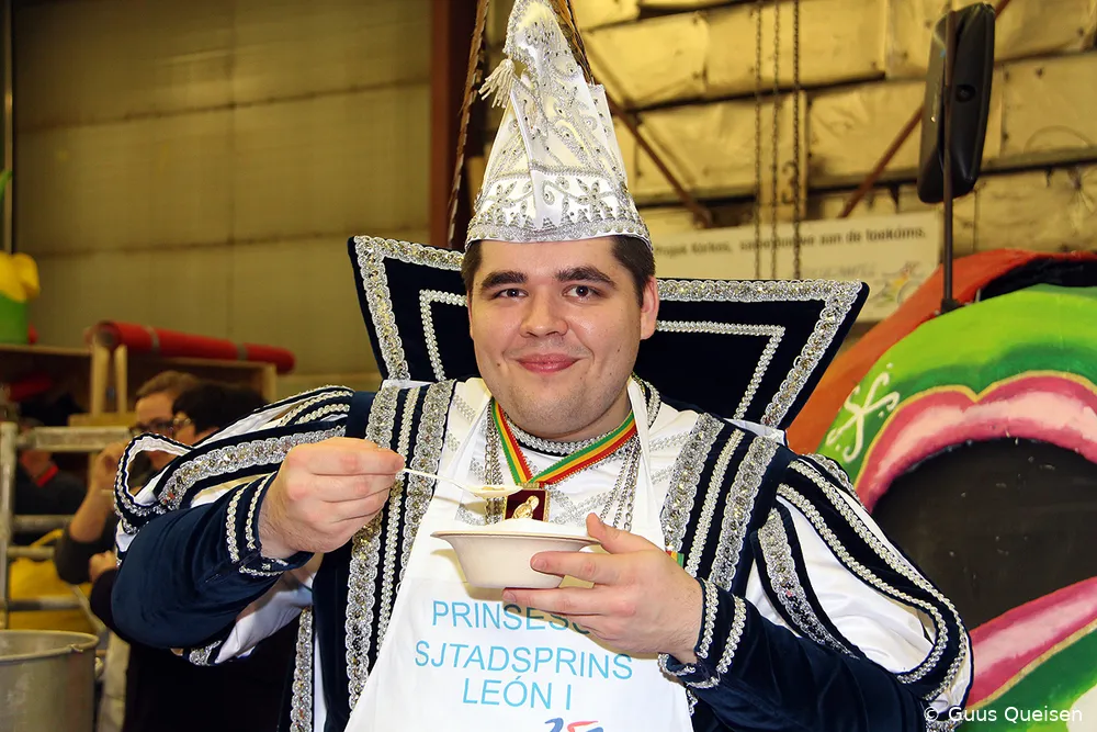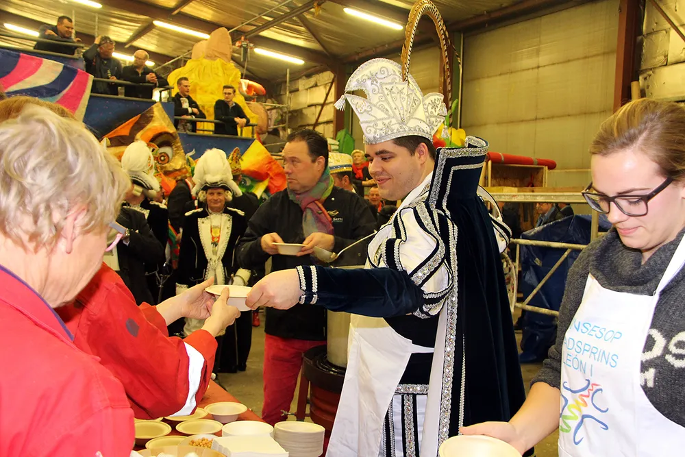 Dinsdagavond trakteerde de Sittardse stadsprins Léon I de wagenbouwers in de optochthal aan het Fischerpad op een lekkere kop soep.