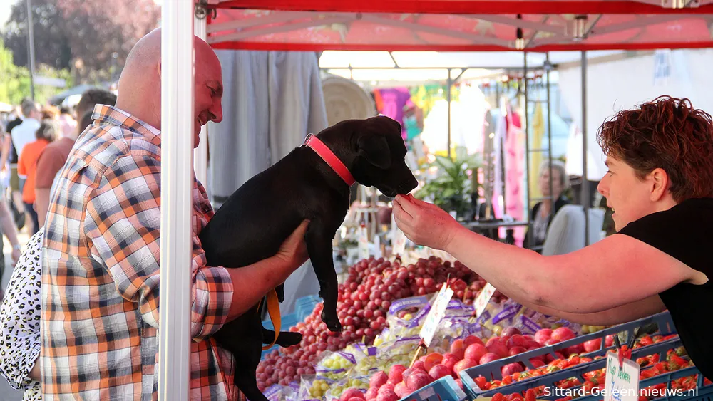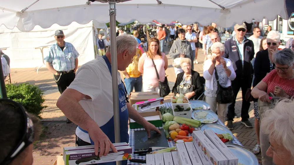 De markt werd vanochtend om 10:00 uur officieel geopend, maar rond die tijd liep er al heel veel publiek over het marktparcours, waar behalve stille kramers ook een aantal standwerkers hun waren aanprezen. “Niet voor het geld, maar voor mijn hobby”, zo legt een verkoper van messen aan zijn gehoor uit. “Het is wel een dure hobby: ze is 1m80 groot en blond.”