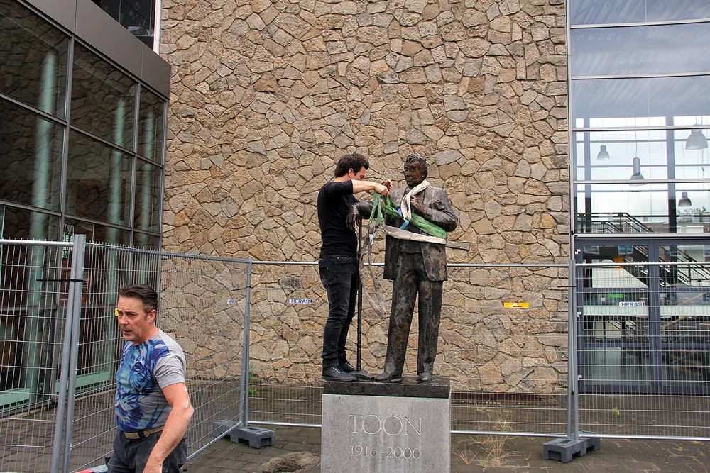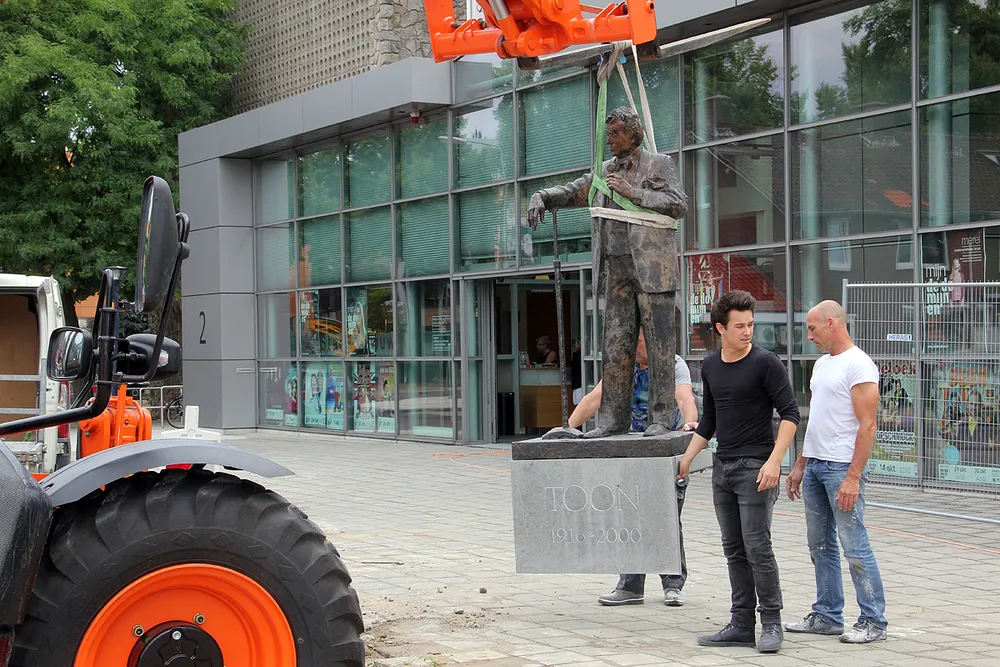 Het bekende bronzen beeld van Toon Hermans naast de schouwburg in Sittard is daar vrijdagmiddag weggehaald. Niet door bronsdieven, maar door de organisatie van de expositie Toon Thuis.
