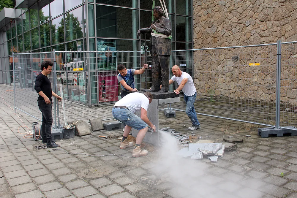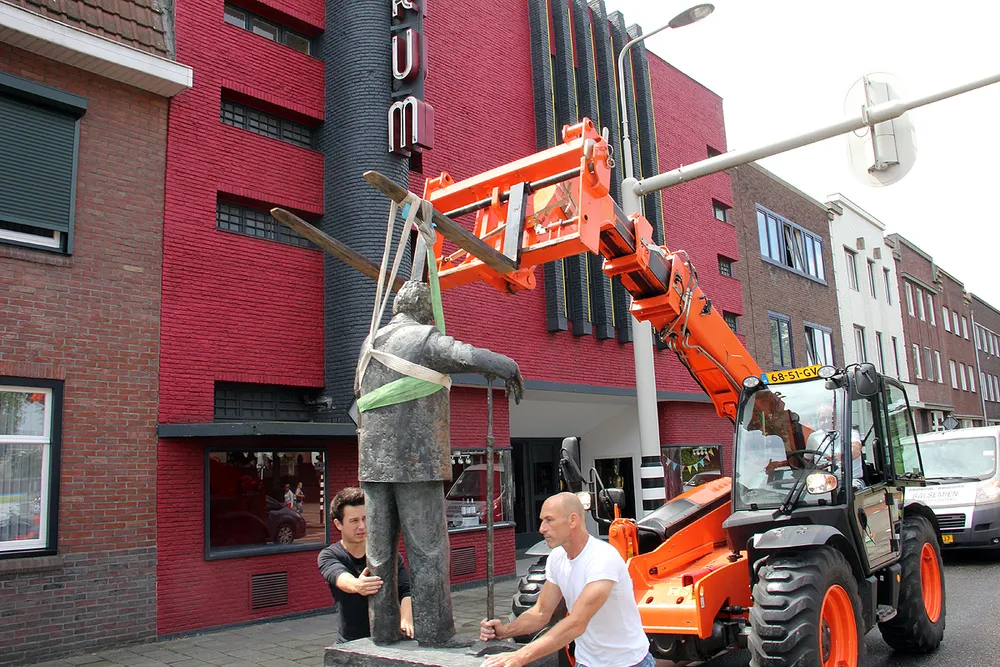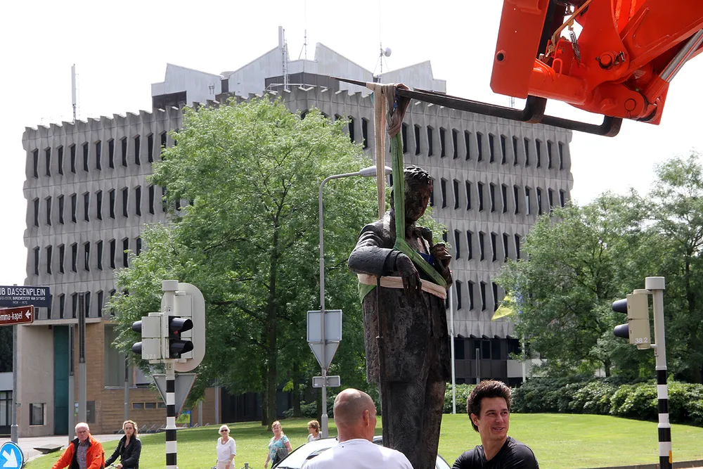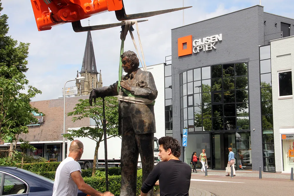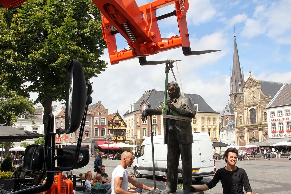 Een eerste poging om het bronzen beeld van zijn sokkel te lichten werd dinsdagmiddag ondernomen, maar mislukte omdat het beeld bijzonder stevig verankerd bleek aan de stenen sokkel. Daarom werd het bedrijf, dat het beeld in 2001 zo diefstal-proof op de sokkel had geplaatst, om raad gevraagd. Uiteindelijk werd besloten om de sokkel te slopen. Dat gebeurde vrijdagmiddag onder het toeziend oog van Gaby Hermans, waarna het 300 kilogram zware kunstwerk, hangend onder een heftruck, stapvoets van de Monseigneur Claessensstraat naar de Markt werd gereden.