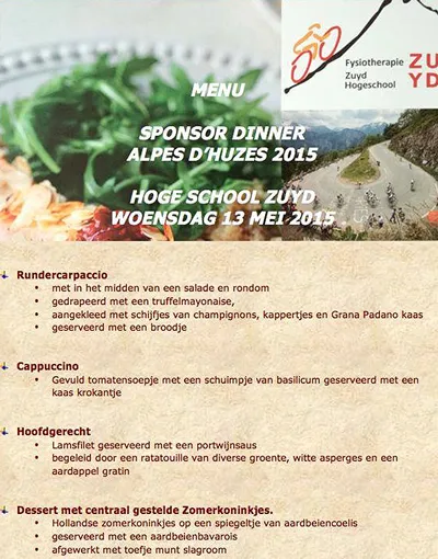 "Wij, de studenten, zijn erg dankbaar hier een steentje aan te mogen bijdragen. Het merendeel van de kosten betreffende vervoer en verblijf dragen we zelf. We willen echter graag ook een geldbedrag inzamelen namens Hogeschool Zuyd, dat gedoneerd wordt aan Alpe d’HuZes. Hiervoor zijn we dan ook op zoek naar sponsoren! We willen jullie dan ook graag uitnodigen voor ons Sponsor Diner op 13 mei in ’t Volkshoes te Geleen. Vanuit de omgeving Sittard-Geleen heten Sanne Waterlander, Mick Hoen, Audrey Arbeel en Lana Luijten jullie van harte welkom!"