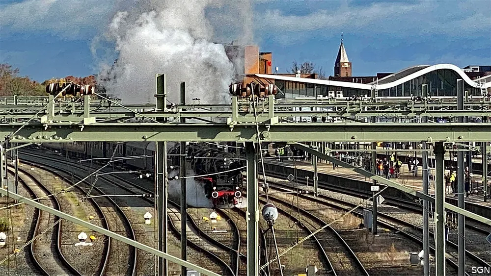 De 01 1075 en 23 023 met daarachter een aantal bomvolle oude passagierswagons passeerden zaterdagochtend om 11:11 uur het station van Sittard. Daar werd op het stationsemplacement op enkele sporen afstand van de perrons een aantal minuten stilgehouden, zodat het reguliere treinverkeer normaal doorgang kon vinden, om vervolgens stoom te zetten richting Maastricht.