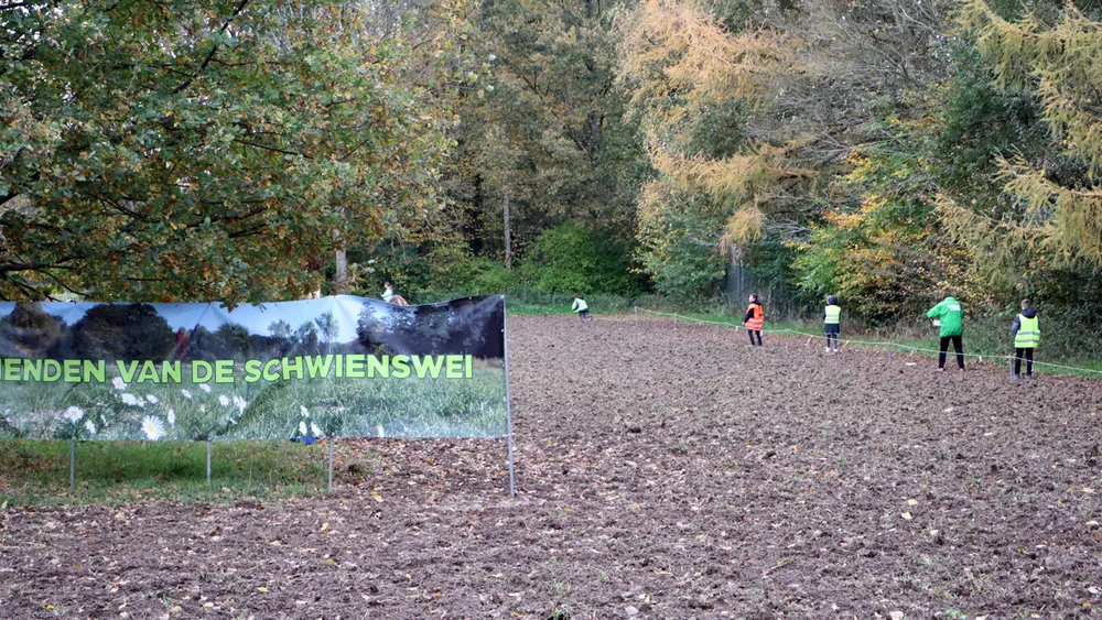 Op zaterdag 3 oktober werd een grasveld op de Schwienswei omgeploegd met het doel er een bloemenweide van te maken.