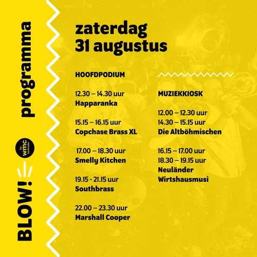 BLOW! by WMC is meer dan een festival; het is een feest van blaasmuziek in al zijn vormen. Zorg ervoor dat je dit muzikale feest niet mist! Tickets voor zaterdag zijn verkrijgbaar voor € 25,- en de zondag is gratis toegankelijk. Het Frühschoppakket (zondag) is beschikbaar voor € 15,-. Reserveer nu jouw tickets op blowbywmc.nl en beleef een weekend vol muziek!
