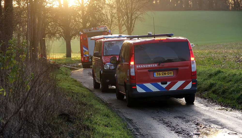 De brandweer onderzoekt de vaten, waarvan er mogelijk enkele vloeistof lekken. Het gaat waarschijnlijk om chemisch afval van een drugslab.