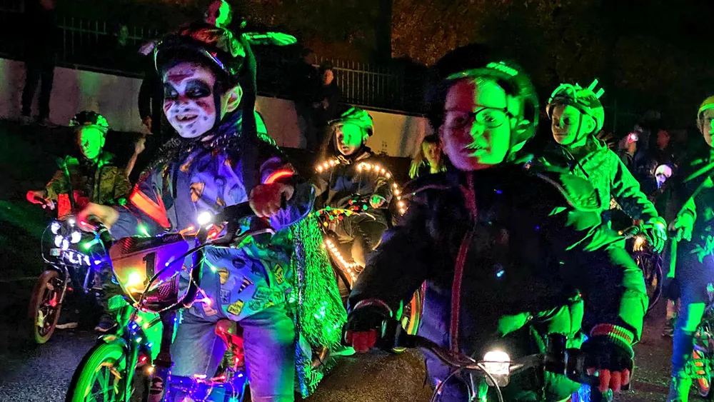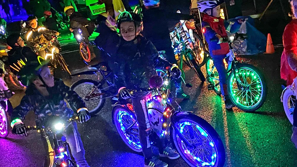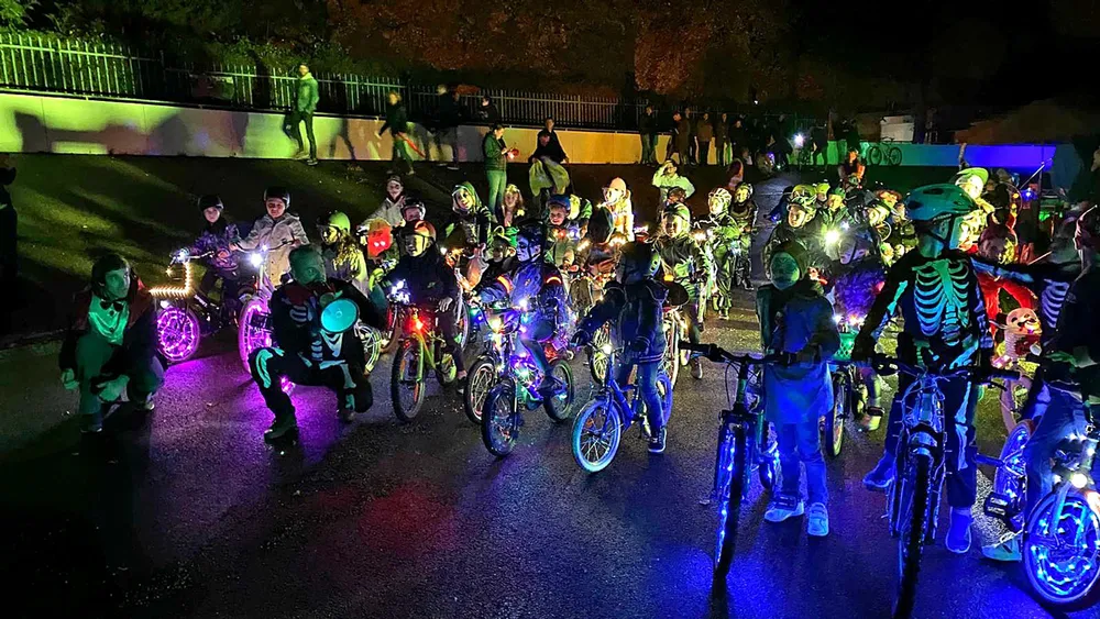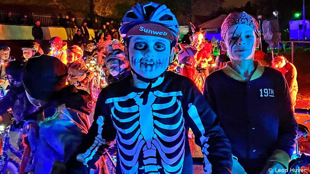 Ruim 45 verklede kinderen deden op hun met lampjes versierde fietsen mee aan de speciale fietsvaardigheidsles. Mooie belichting, een rookmachine en passende muziek - onder andere Michael Jacksons Thriller en het theme van Ghostbusters - zorgden voor de juiste sfeer.
