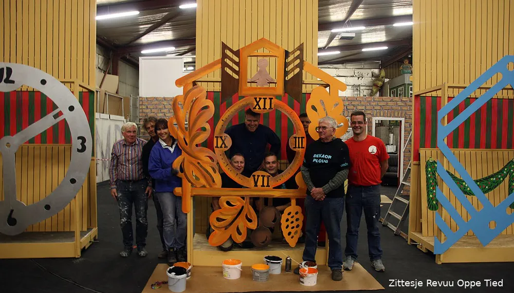 In juni is begonnen met het bouwen van de tientallen decorstukken die gebruikt gaan worden in de Sittardse revue Oppetied. Een groep van 22 enthousiaste en zeer betrokken personen is hier meerdere keren per week mee bezig onder leiding van Leon Beursgens. "De decorploeg is een hecht team dat met veel plezier al menige revue met elkaar heeft samengewerkt. De groep kent beslist niet alleen mannen zoals zo vaak gedacht wordt. Meerdere dames helpen wekelijks mee met de decors. De kern van de decorploeg bestaat uit wagenbouwers, aangevuld met personen uit verschillende verenigingen uit Sittard of vrijwilligers met een eigen klusbedrijf", aldus Leon Beursgens.