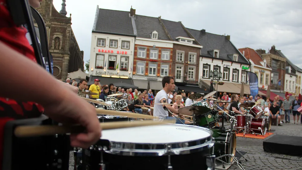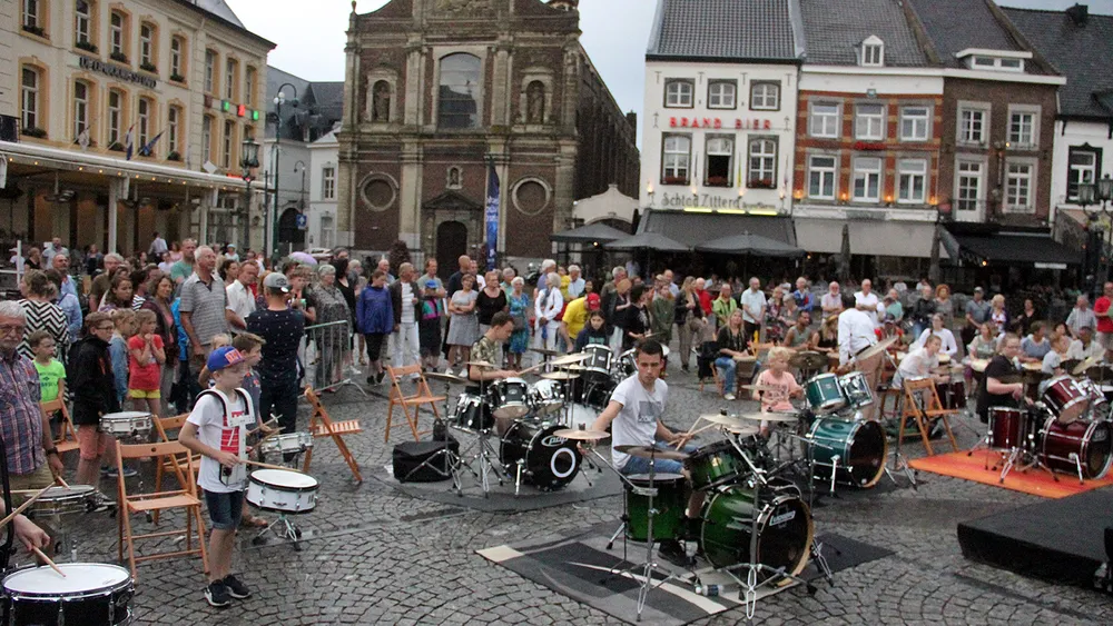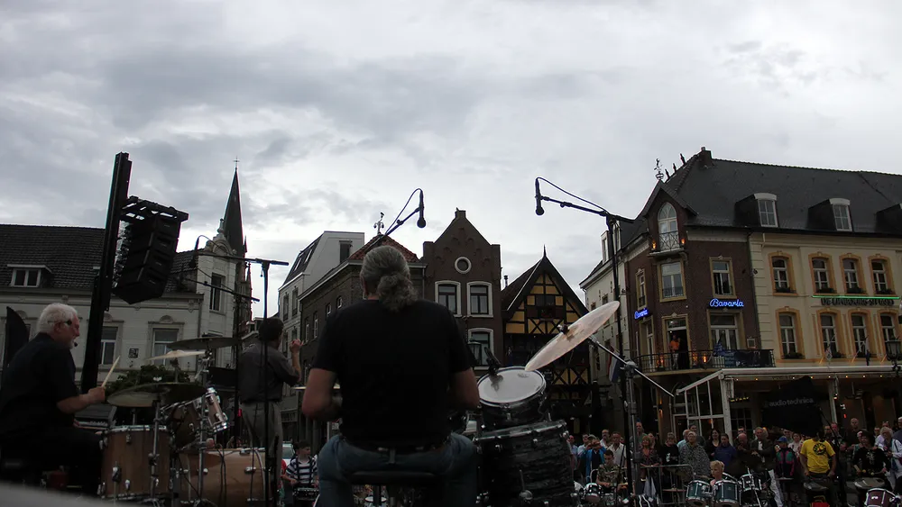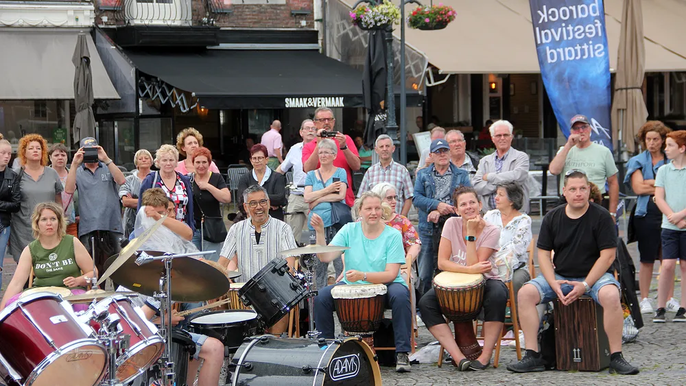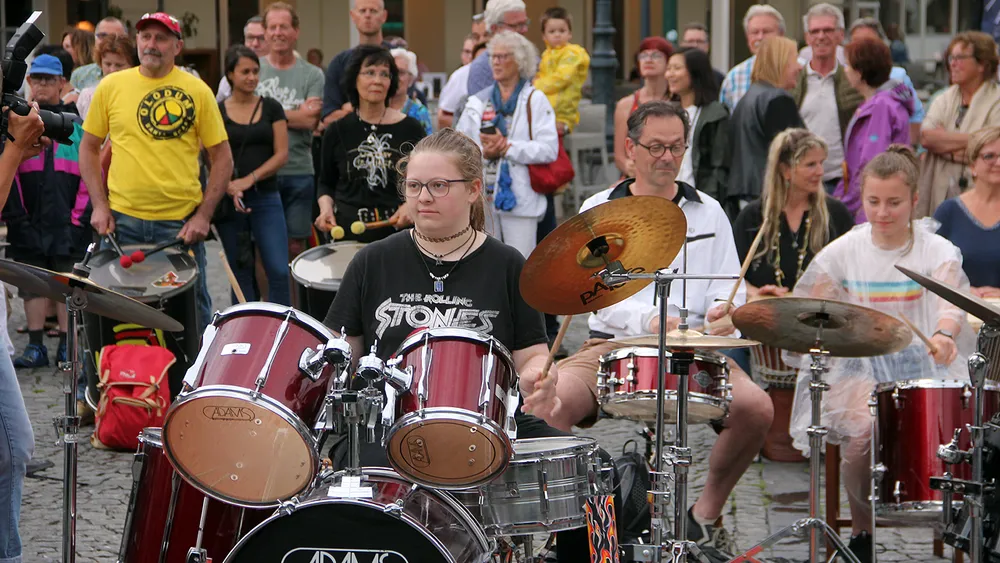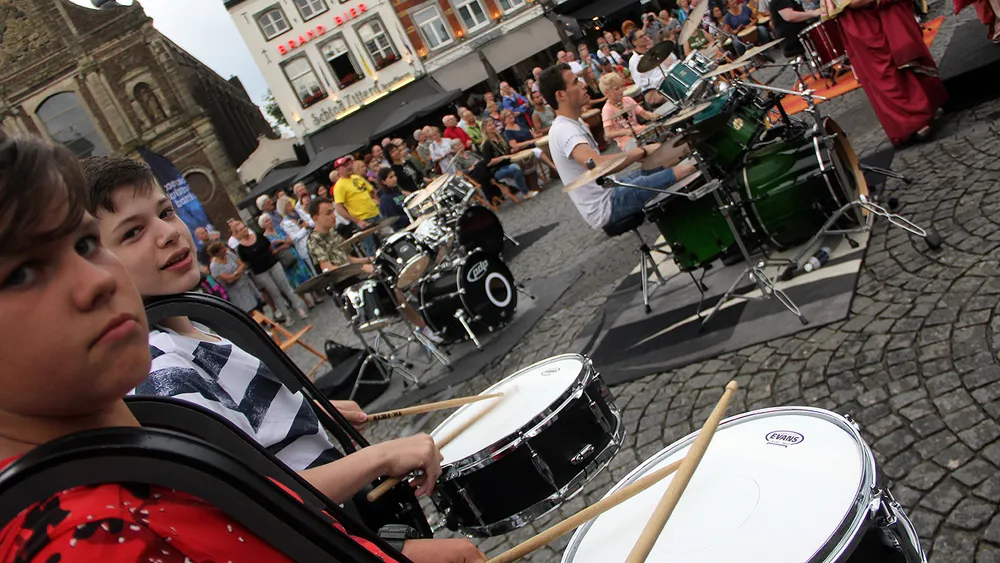 Golden Earring-drummer Cesar Zuiderwijk en muziekdocent/slagwerker/componist Gian Prince (eine jóng van Zitterd) namen plaats op het podium om vervolgens, na de openingstoespraak en -gongslag van burgemeester Sjraar Cox, een groep van zo'n 30 slagwerkers aan te sturen.