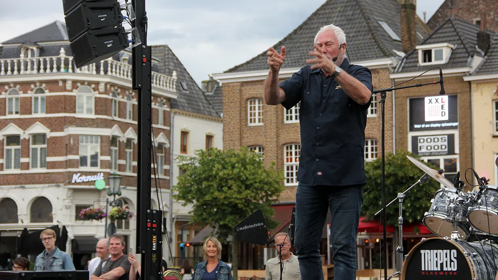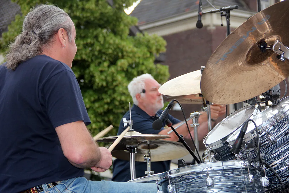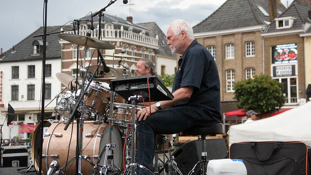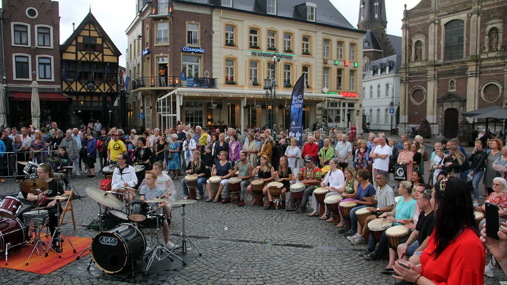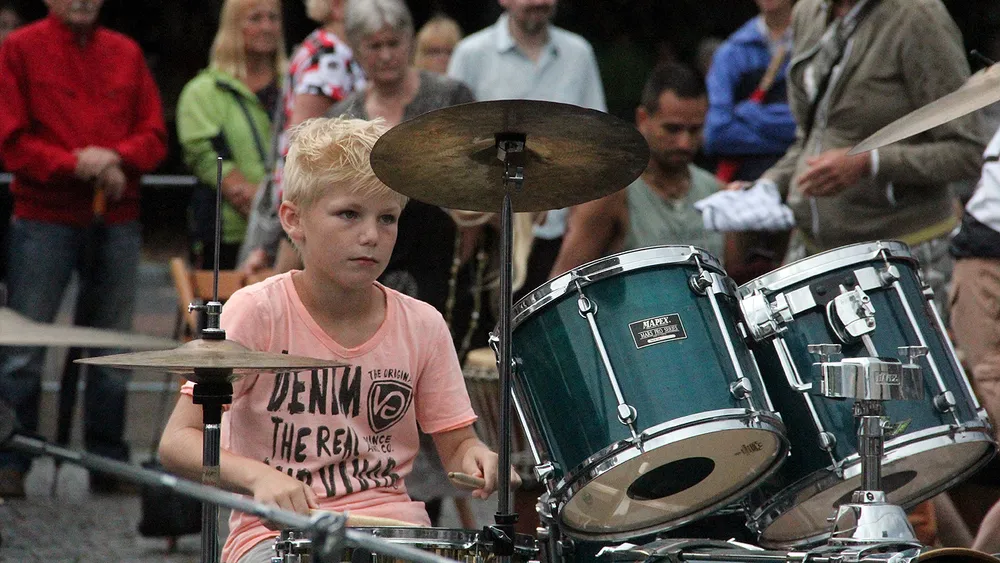 Golden Earring-drummer Cesar Zuiderwijk en muziekdocent/slagwerker/componist Gian Prince (eine jóng van Zitterd) namen plaats op het podium om vervolgens, na de openingstoespraak en -gongslag van burgemeester Sjraar Cox, een groep van zo'n 30 slagwerkers aan te sturen.