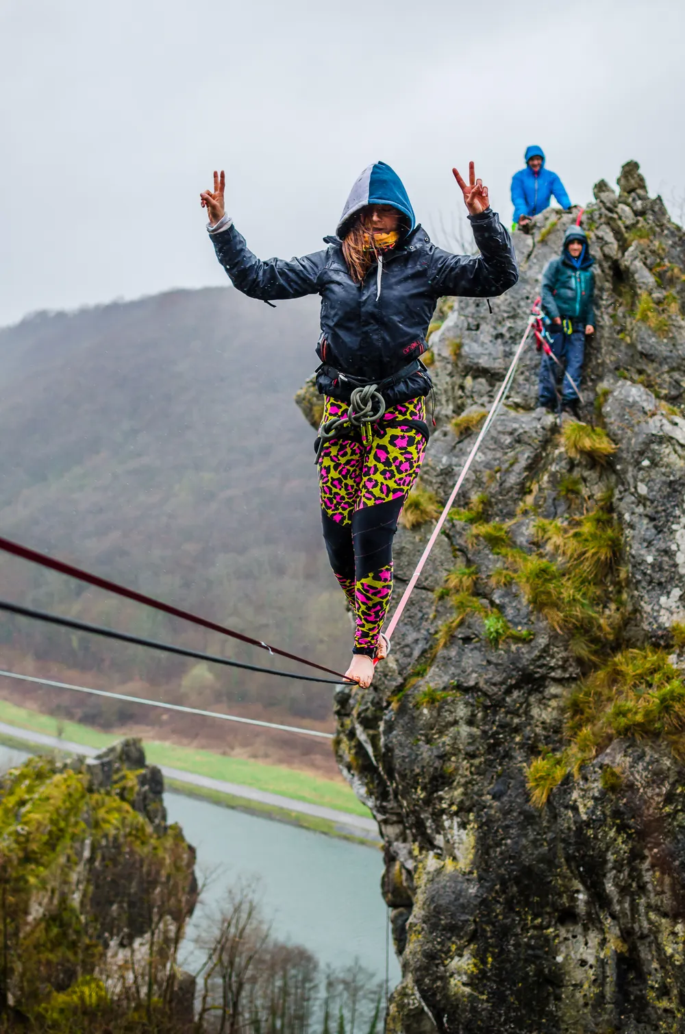 Highliners uit heel Europa geven tijdens de openingsdag van het zevende Dutch Mountain Film festival op 10 februari in Kerkrade een spectaculaire demonstratie.