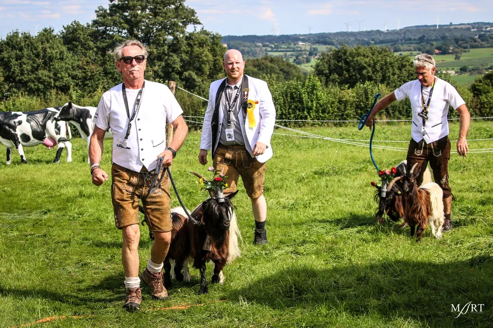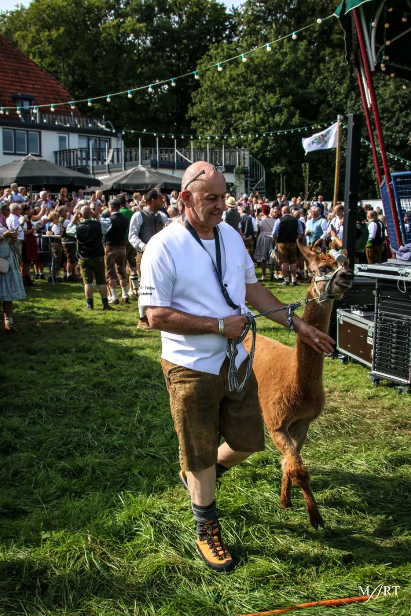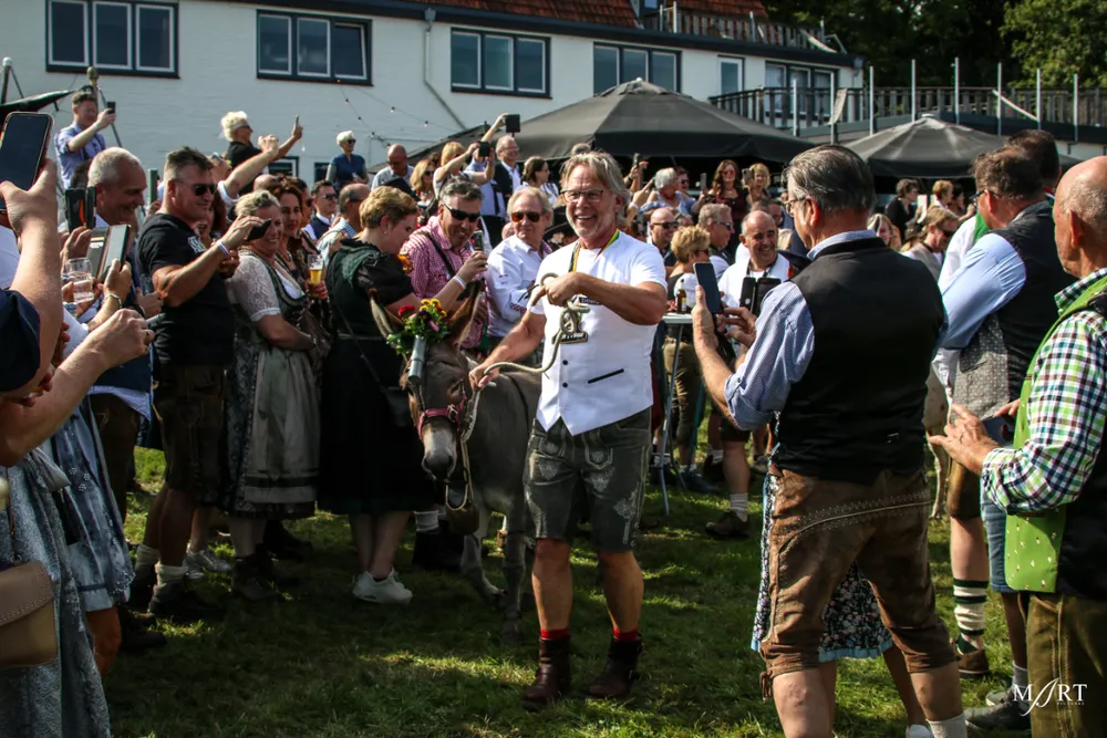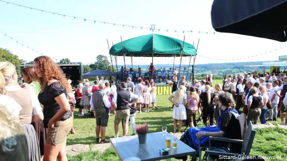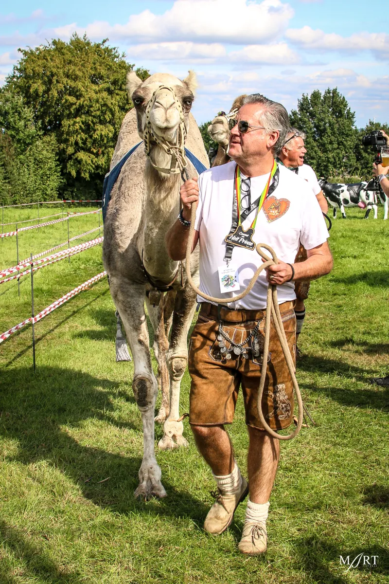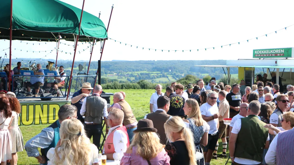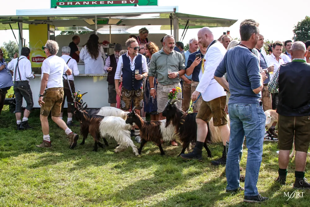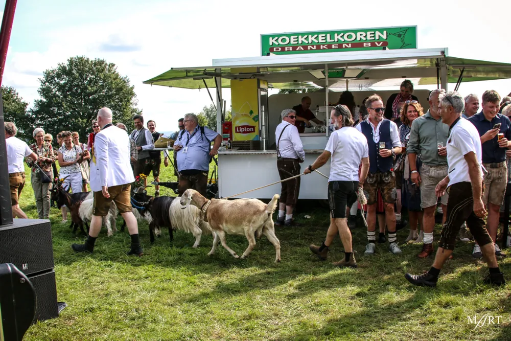 Als zo’n idee eenmaal landt in het brein van CVNP-baas Ton Meisen is er geen houden meer aan. En zo kwam het dat afgelopen zondag op een zonovergoten weide naast ‘t Voshoes in het prachtige Limburgse heuvelland, met in de verte aan de overkant van het dal het kerkje van Vijlen, werd gefrüshopt met muziek van de in Sittard normaliter enkel tijdens Oktoberfeestzondag optredende Zu Helle Kapelle. DJ Tonnie’s Viniellie, DJ Dirndl, de Böhmerwaldkapel en de Philharmoniker completeerden het programma, dat tot 18:00 uur duurde en dat om 14:00 uur werd onderbroken voor de Almrundtrieb. Ditmaal echter zonder koeien, maar wel met geiten, ezels, mini-paardjes, lama’s, alpaca’s een dromedaris en een kameel. Klik op de foto boven dit bericht om de door Mart Cremers gemaakte foto's te bekijken.