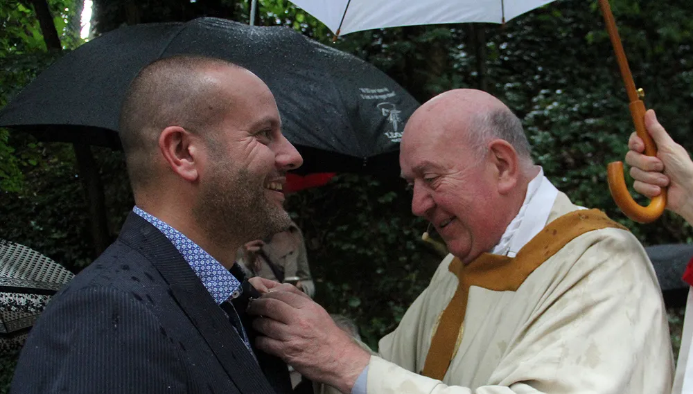 Deken Van Rens zegende vanavond de belangeloos door Marc Webers ontworpenreversspeldjes. De verkoop van die speldjes moet ertoe bijdragen dat het St.-Rosacomité wat extra inkomsten kan verwerven. Het comité zorgt voor het onderhoud van de voetvallen en de eeuwenoude St.-Rosakapel en werkt zo mee aan het in stand houden van de St.-Rosaprocessie, die sinds 1675 jaarlijks op de laatste zondag van augustus van de St.-Michielskerk naar de kapel op de Kollenberg trekt.