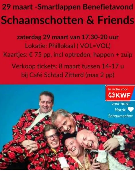 Wil je KWF Kankerbestrijding sponsoren en genieten van het laatste concert van de Schaamschotten én vrienden en ook nog verzorgd worden met een smartlappendiner en 5 consumpties? Kom dan aanstaande zaterdag vanaf 14 uur naar Schtad Zitterd en koop een kaartje voor € 75 voor 29 maart tussen 17:30 en 20:00 uur.