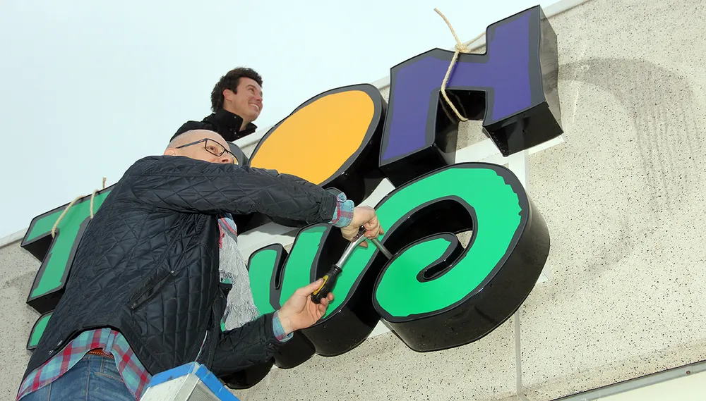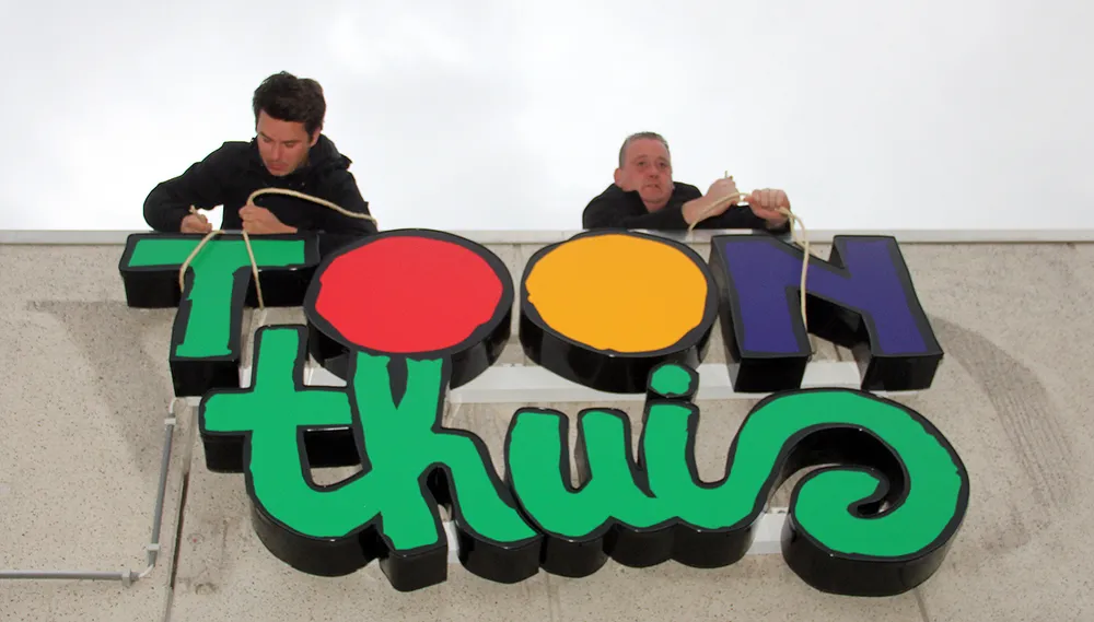 Het team dat meehielp de expositie op te bouwen en in te richten - veel wagenbouwers uit de Sittardse optochthal - ruimde ook alles weer op. Vrijdagavond haalden zij in het bijzijn van Toon's jongste zoon Gaby als laatste de lichtreclame voor de expositie van de gevel van het voormalige pand van V&D. Voor hen zit de belevingsexpositie Toon Thuis er nu dan ook helemaal op. Dat werd afgesloten met een gezellige borrel bij Tapperie De Gats.