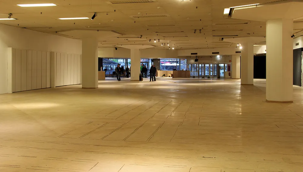 Bijna al het materiaal dat werd aangeschaft voor het opbouwen van de expositie - de afscheidingen en de verschillende ruimtes - is eveneens opgeslagen, want het is volledig herbruikbaar in een andere setting.