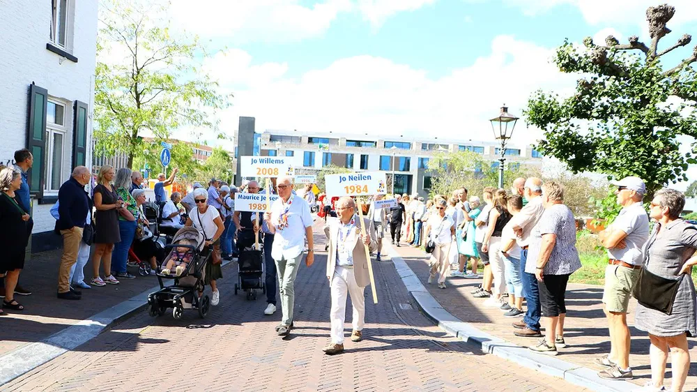 Het betrof een jubileumoptocht en -schuttersfeest, dat een halve eeuw geleden voor het eerst werd georganiseerd. Een viertal heren werd voorafgaand aan de schuttersoptocht in het zonnetje gezet. Het viertal - Ton Kamps, Zef Paquay, Math Nohlmans en Ger Kreutzkamp (foto boven dit bericht) - was er 50 jaar geleden al bij. Achter hen liep een aantal ex-keizers mee en daarachter volgden de 20 deelnemende 'schutterijen', waarin zich eveneens een aantal oud-keizers bevonden. Onderaan dit bericht vindt u een korte fotoreportage van de stoet.