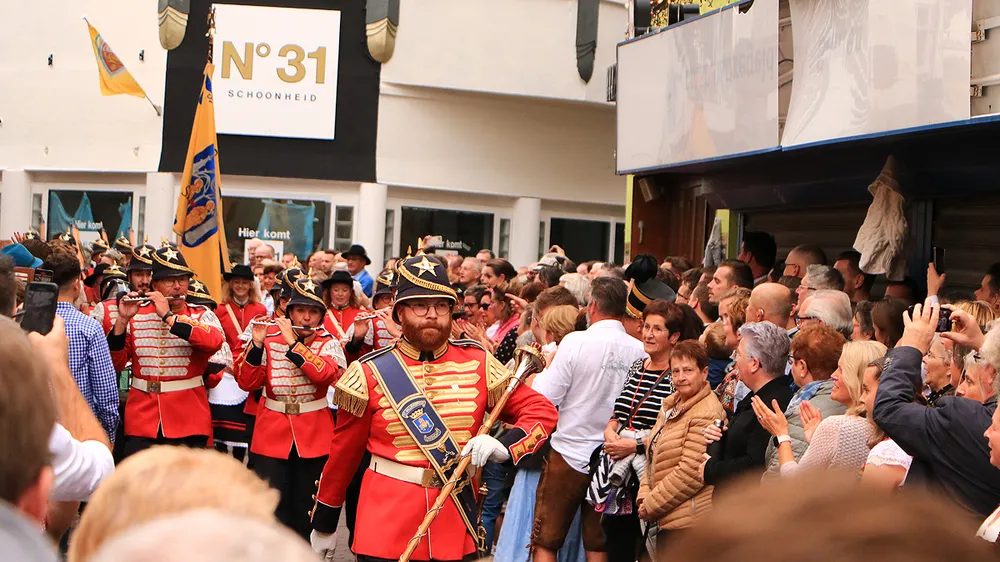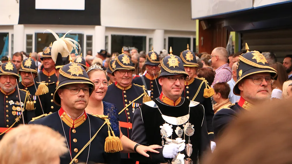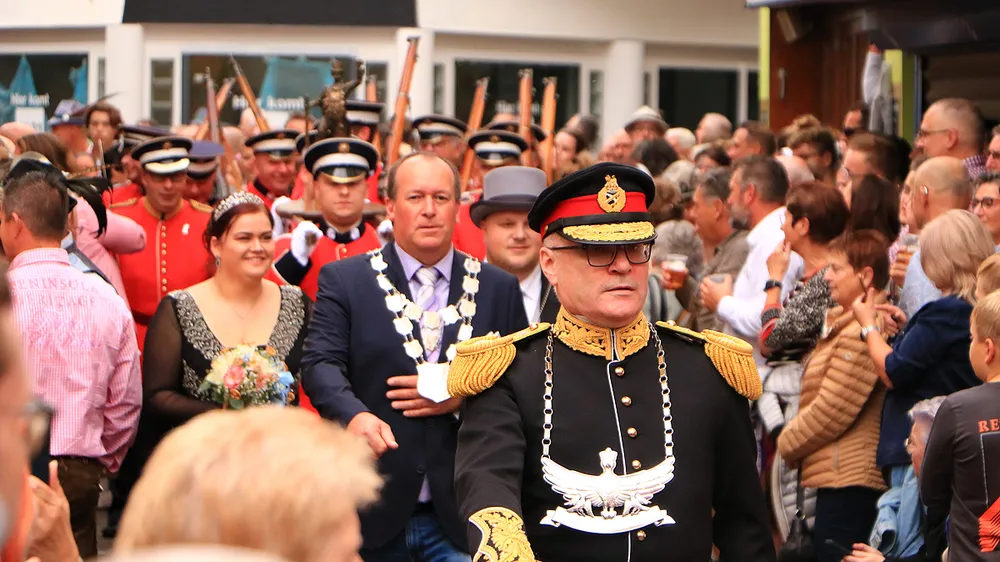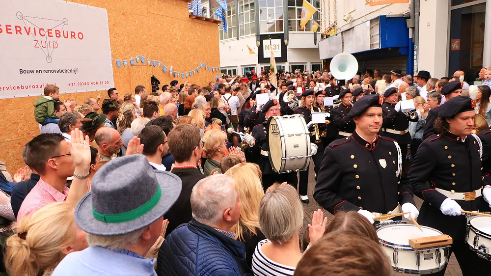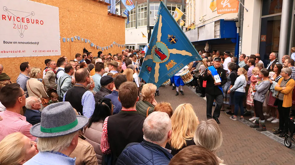 De deelnemers werden zondagochtend ontvangen in het Brand Weizenpaviljoen en werden daarbij welkom geheten door Fred den Rooijen, voorzitter van de organiserende stichting. Hij zette samen met burgemeester Hans Verheijen twee lokale schutterijen in het zonnetje door de zestallen van schutterij Sint Martinus uit Born en die van Sint Willibrordus uit Obbicht op de bühne te roepen; de winnaar en de 'vice-winnaar' van het Oud Limburgs Schuttersfeest 2022. (Lees verder onder de foto.)