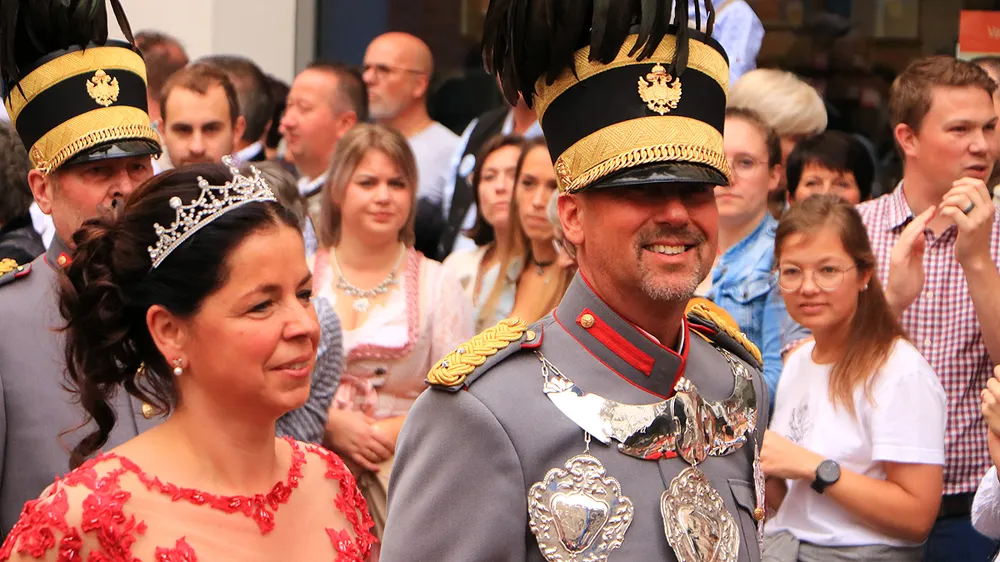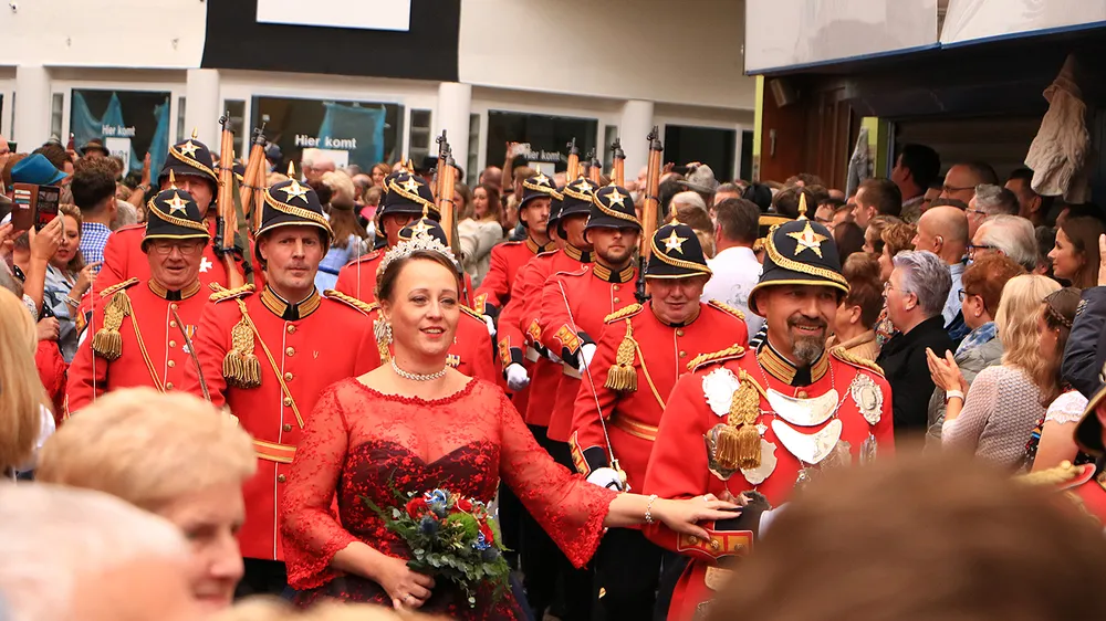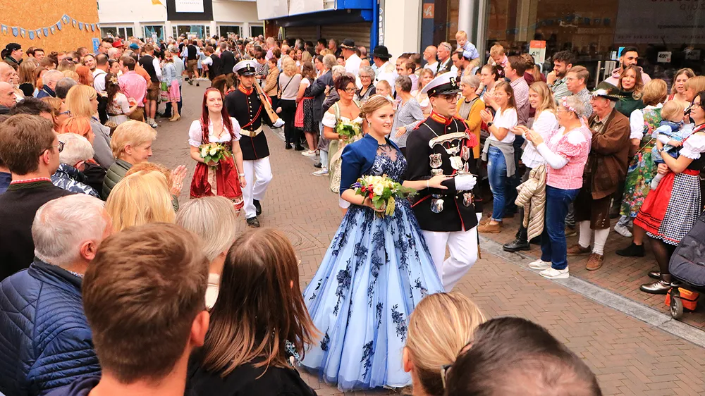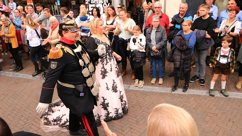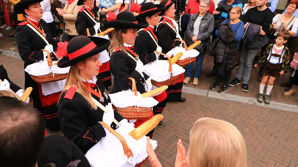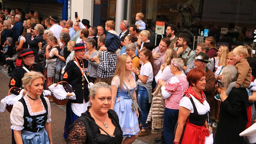 De deelnemers werden zondagochtend ontvangen in het Brand Weizenpaviljoen en werden daarbij welkom geheten door Fred den Rooijen, voorzitter van de organiserende stichting. Hij zette samen met burgemeester Hans Verheijen twee lokale schutterijen in het zonnetje door de zestallen van schutterij Sint Martinus uit Born en die van Sint Willibrordus uit Obbicht op de bühne te roepen; de winnaar en de 'vice-winnaar' van het Oud Limburgs Schuttersfeest 2022. (Lees verder onder de foto.)
