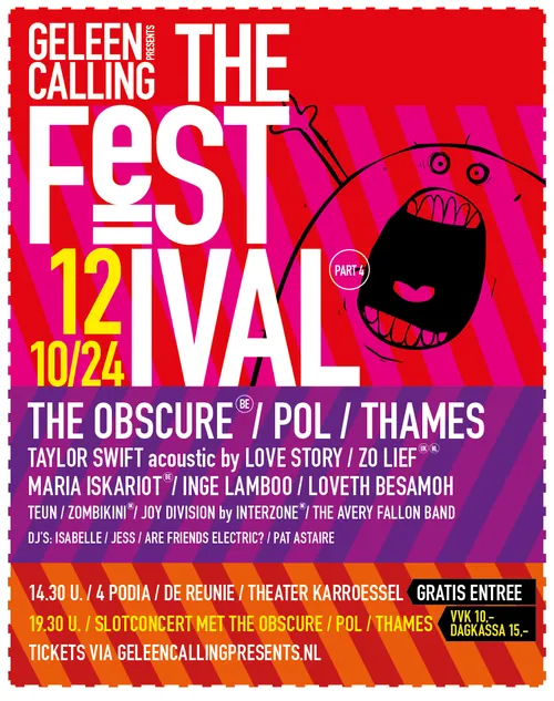 Komen de liefhebbers van Postpunk en New Wave sowieso goed aan hun trekken in concertzaal de Reünie, de liefhebbers van pop krijgen in Theater de Karroessel een heerlijk programma gepresenteerd. En pendelen tussen beide locaties (1 minuut looptijd) zorgt voor een nóg betere beleving van alles wat op dit moment “hot” is in muziekland.