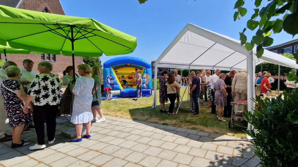 Na de H. Mis ging iedereen naar de naast de kerk gelegen Gelderhof voor koffie, vlaai en een drankje. DE Kinderen amuseerden zich op een springkussen en met schminken.