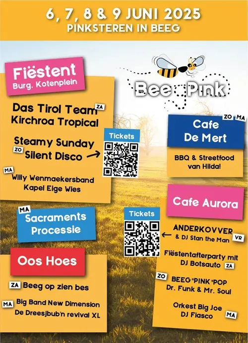 De rest van het weekend staat bol van de activiteiten. Op zaterdagavond opent het feestpaviljoen met optredens van de vernieuwende polkaband Das Tirol Team en de Limburgse internethit Kirchroa Tropical. Zondag is het tijd voor BeegPinkPop bij Café Aurora, met onder andere The Rockchicks, en als spectaculaire afsluiter volgt de nieuwe Silent Disco: Steamy Sunday in de feesttent.