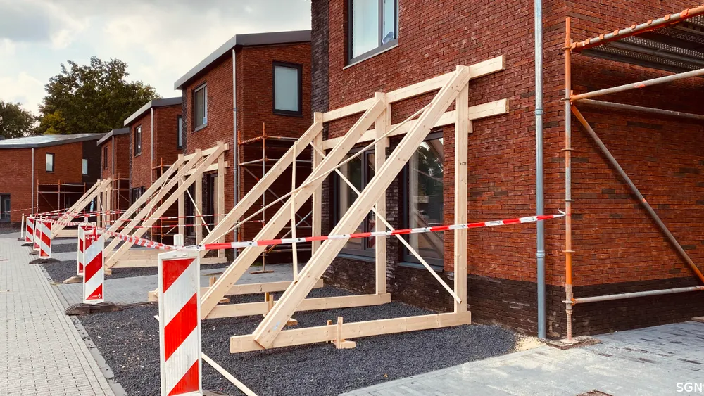 Afgelopen dagen werden de gevels van de pas drie jaar oude woningen in allerijl gestut. De bakstenen gevelbekledingen blijken allemaal de nodige problemen te vertonen. Er zijn scheuren en verzakkingen zichtbaar en op sommige plekken lijken de bakstenen los van de gevel te komen. Bij een van de woningen viel aan de achterzijde een groot stuk muur naar beneden. Daarbij raakte niemand gewond. Mogelijk zijn de problemen mede ontstaan en versterkt door de hitte van de afgelopen tijd.