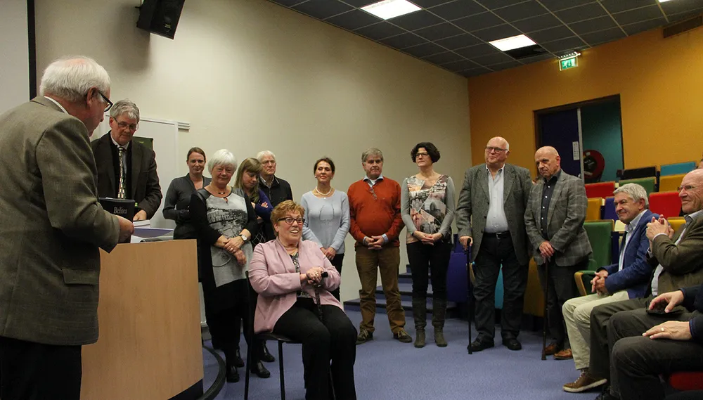 De eerste exemplaren van het Gruin Buikske werden vrijdagavond in het Trevianum aangeboden aan professor Van Hout, hoogleraar Taal- en literatuurwetenschappen aan de Radboud Universiteit van Nijmegen, en aan wethouder van cultuur Noël Lebens.