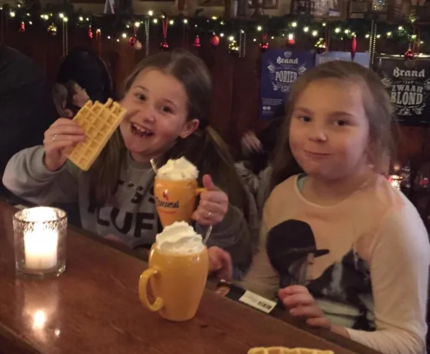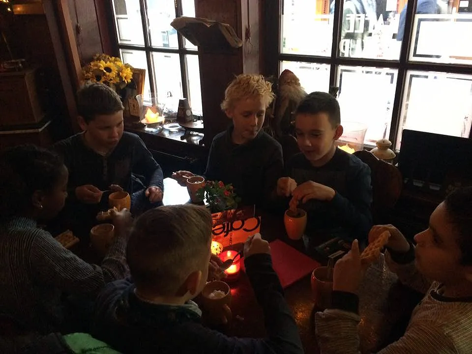 Maar er was nóg een verrassing voor de hele klas: na afloop werden alle kinderen door Meid van Sittard Corina en haar man Jan bij Kafee De Kup getrakteerd op een kop warme chocolademelk met slagroom én een wafel. Daarmee was het feest compleet!