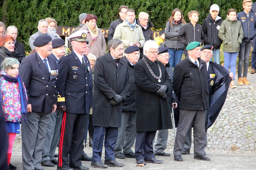 Hoogwaardigheidsbekleders van bestuurlijke overheden - waaronder burgemeester Cox en Gouverneur Bovens, militaire organisaties, vele oud-mariniers die zijn aangesloten bij het COM (Contact Oud-Mariniers) de fanfare Sint Jan Leyenbroek en de Stadsschutterij Sint Rosa Sittard werkten aan de herdenking mee. De kransen werden aangereikt door leerlingen van basisschool Leyenbroek.