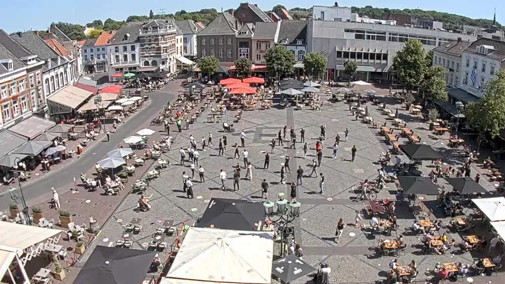 Even na 15:00 uur stroomde het middenterrein van de Markt in Sittard - met inachtneming van anderhalve meter afstand - ‘vol’ met horecamedewerkers van de omliggende café’s en restaurants om middels een korte flashmobachtige actie uiting te geven aan hun blijdschap en opluchting dat ze weer aan de bak mogen en hun gasten weer terugzien.