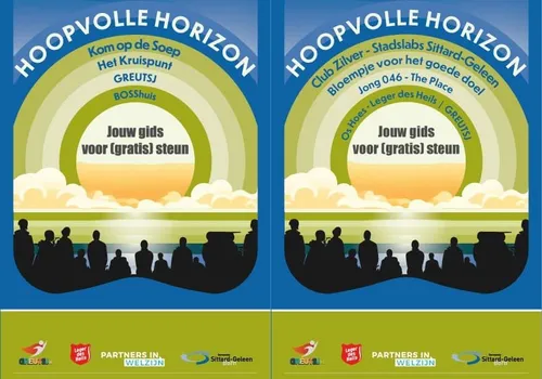 Maar waar vind je die? Posters en flyers onder het motto "Hoopvolle horizon" wijzen de weg en zijn nu beschikbaar op tal van plekken in Sittard en in Geleen. Voor beide stadsdelen zijn er aparte folders. Deelnemers zijn onder andere Greutsj, Leger des Heils, Partners in Welzijn, Club Zilver, Bloempje voor het goede doel, Jong-046, The Place, Kom op de Soep, Het Kruispunt, BOSS huis en de gemeente Sittard-Geleen.