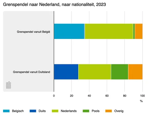 Een deel van de mensen uit Duitsland en België die in Nederland werken, heeft de Nederlandse nationaliteit. Dat gold voor 54 procent van de grenspendelaars uit België en 37 procent van die uit Duitsland. Van de grenspendelaars uit België had 35 procent de Belgische nationaliteit. Van de grenspendelaars uit Duitsland had 28 procent de Duitse nationaliteit en 19 procent de Poolse nationaliteit.