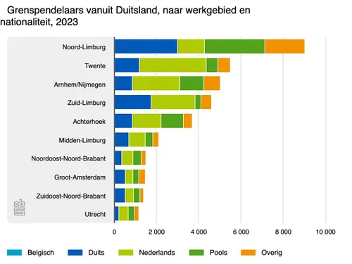 Duitse grenspendelaars werkten vooral in Limburg, Gelderland en Overijssel, en in iets minder mate in Noord-Brabant. Van alle regio’s ontving Noord-Limburg, met als grootste stad Venlo, met 9 duizend de grootste groep pendelaars uit Duitsland. Van hen hadden 3 duizend de Duitse nationaliteit en 3 duizend de Poolse.