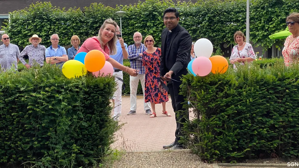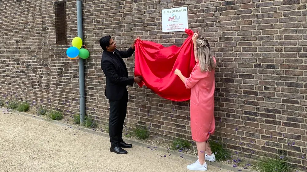 Maar zaterdag was het dan zover. Wethouder Kim Schmitz knipte samen met de recent tot priester gewijde kapelaan Ranil Weerawarna het lint door. Vervolgens onthulden zij samen de naam van de jeu-de-boulesbanen. De eerste but werd geworpen door kapelaan Weerawarna, die na enkele onzeker worpen al snel het juist balgevoel te pakken had.