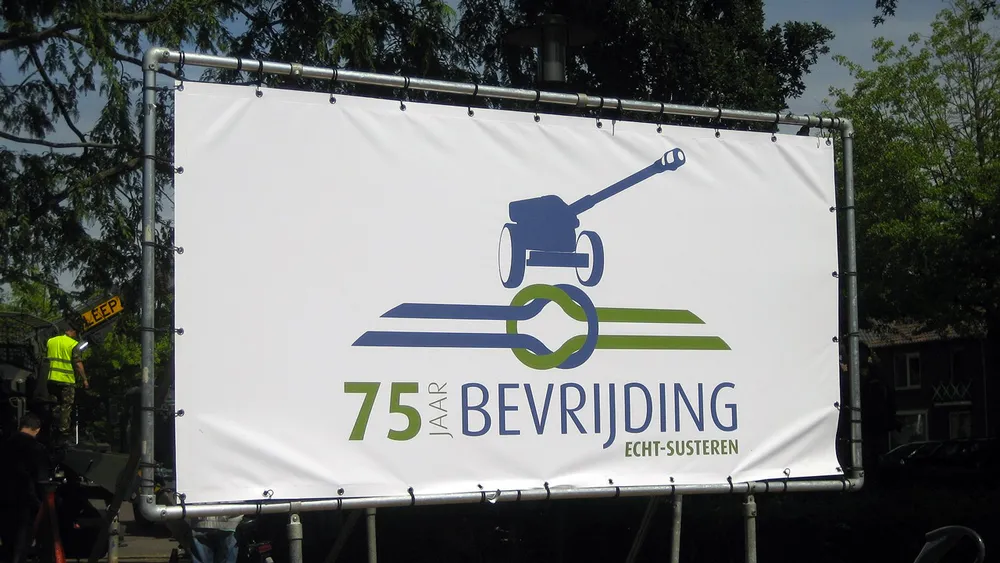 Tijdens de bijeenkomst op het Raadhuisplein werd tevens een banner met het logo voor de viering van 75 jaar bevrijding onthuld.