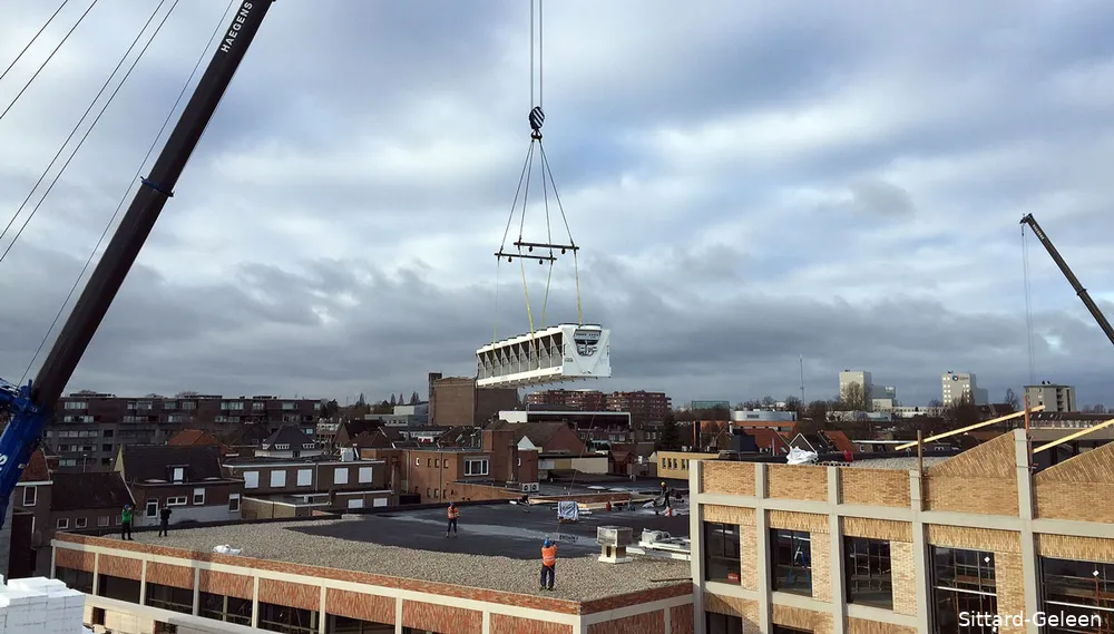 Het plaatsen van de bijbehorende koelventilatoren op het dak was een uitdagende takeloperatie. Rondom de koelventilatoren wordt nog een scherm aangebracht waardoor deze straks nauwelijks zichtbaar zijn.