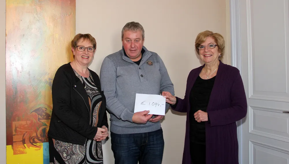 Arno Dols mocht woensdag, namens alle 'Waffelebèkkesj' die tijdens 'Waffelezaoterdig' met Wèntjerdruim 2015 in Sittard wafels bakten en verkochten, twee lokale goede doelen een envelop met een mooie donatie overhandigen.