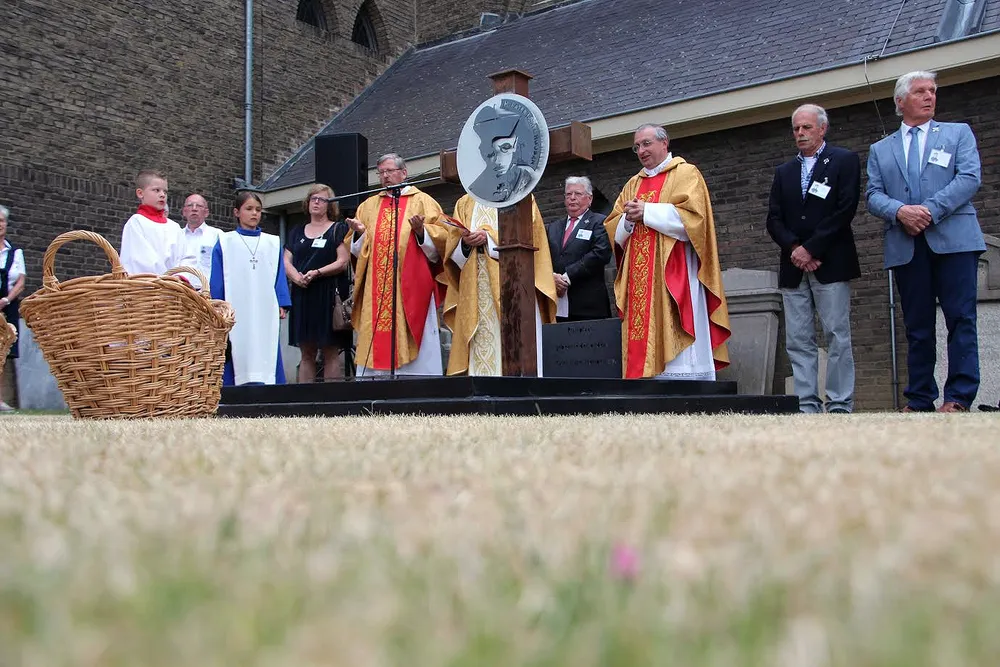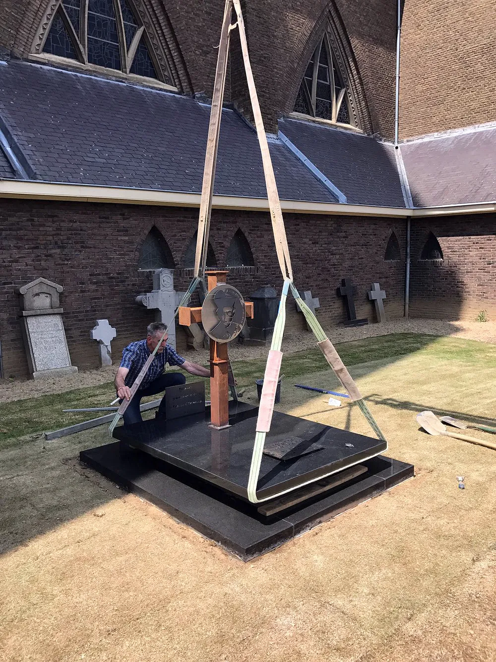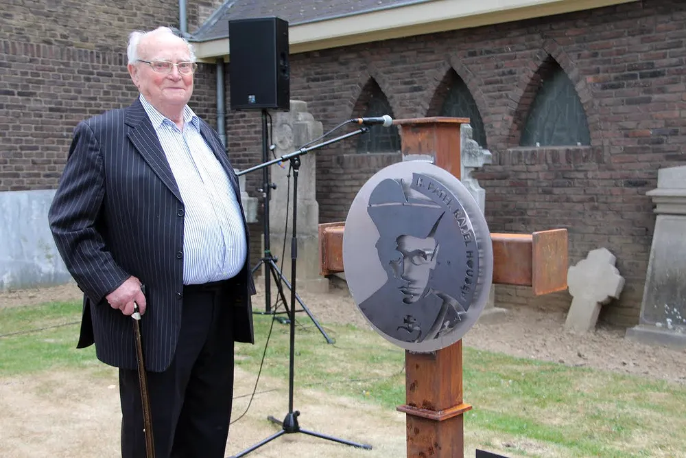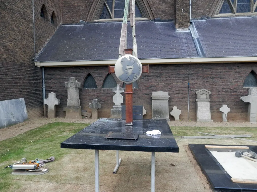 Na de Heilige Mis werd op het kerkhof naast de kerk een monument onthuld op de plek waar de stoffelijke resten van de ouders van Pater Karel en vele anderen zijn herbegraven. "Dankzij de goede herinnering van de heer Thei Keulers uit Geleen zijn we te weten gekomen waar de stoffelijke resten van de ouders - en vele anderen - in een gezamenlijk graf op ons kerkhof zijn herbegraven. We willen deze plek markeren middels het oprichten van een nieuw monument. Zo mogen wij ons realiseren dat het deze ouders waren die Jan-Andries Houben en nog negen kinderen het levenslicht deden zien. Ze kregen een dermate mooie opvoeding dat twee van hen priester werden, terwijl ook uit de volgende generatie weer twee priesters zouden voortkomen", verklaart pastoor Harrie Broers.