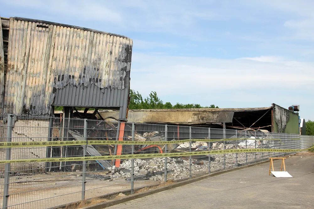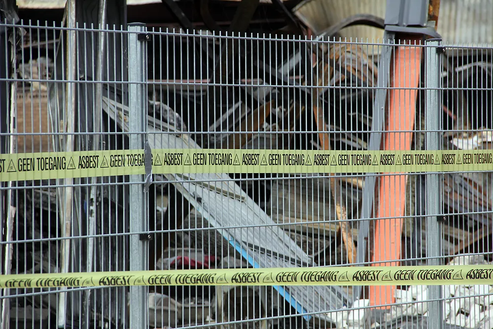 De opruimwerkzaamheden van de volledig verwoeste loods zullen wel enige tijd in beslag nemen. De puinhoop is afgezet met linten met 'Asbest, geen toegang'.