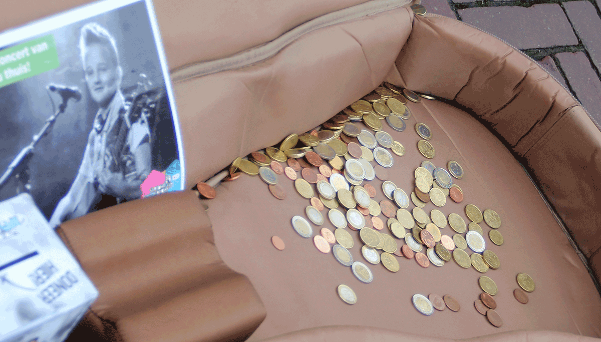 Niels deed dat om geld in te zamelen voor het Glazen Huis, dat dit jaar in Heerlen staat. Terwijl hij zichzelf begeleidde op zijn gitaar wierpen voorbijgangers heel wat muntstukken in het voor hem op de grond liggende gitaarkoffer.