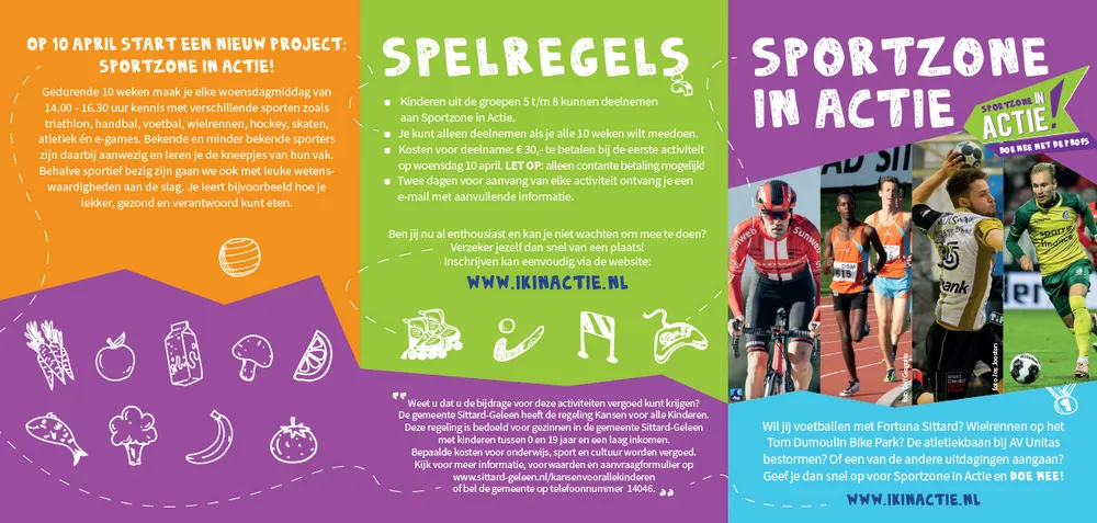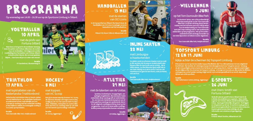 Tien weken lang kunnen kinderen kennismaken met sporten zoals triathlon, handbal, voetbal, wielrennen, hockey, atletiek en E-sports. Deze beweegactiviteiten worden aangeboden door lokale (top)sportaanbieders op de Sportzone Sittard-Geleen. Bekende en minder bekende sporters geven een unieke inkijk in het leven van een prof!