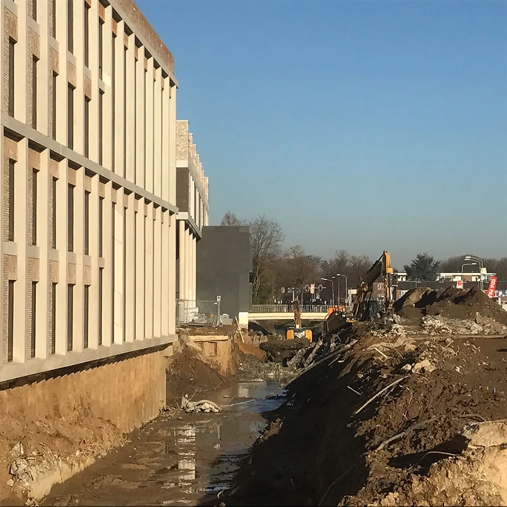 Het meest in het oog springend zijn de werkzaamheden rond de sloop van de zware betonnen overkluizing van de Keutelbeek. De wanden en het dek zijn verwijderd, maar de vloer blijft voorlopig nog liggen totdat de kadewanden onder het gebouw zijn aangebracht.