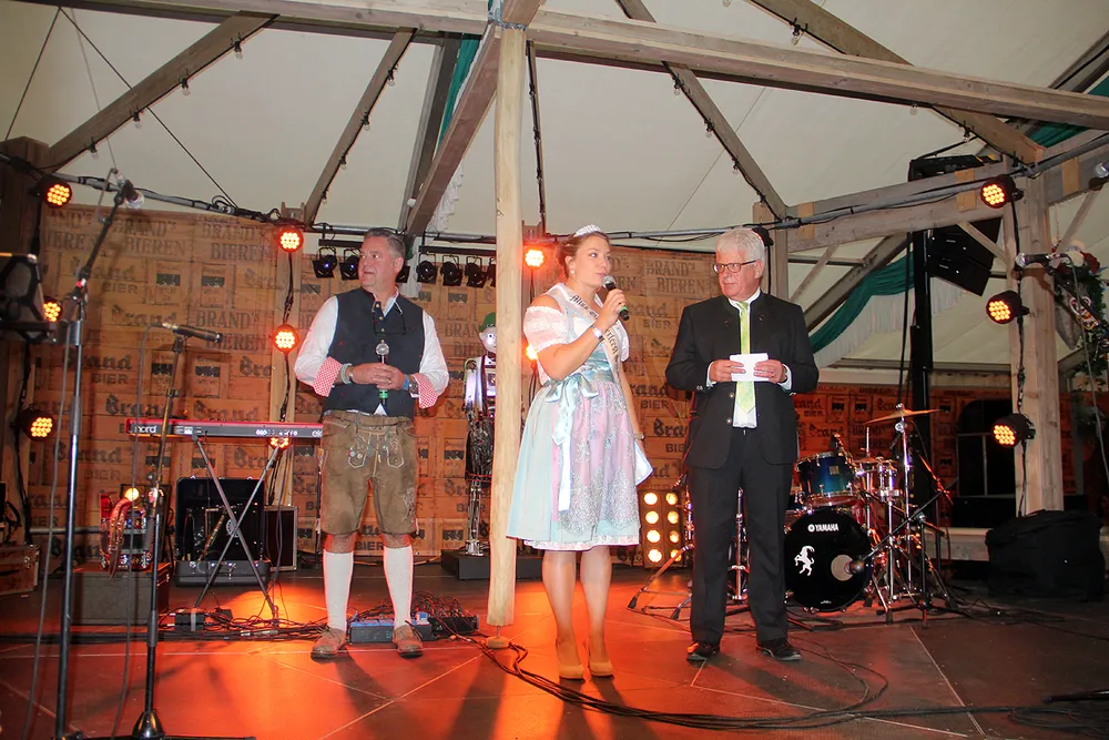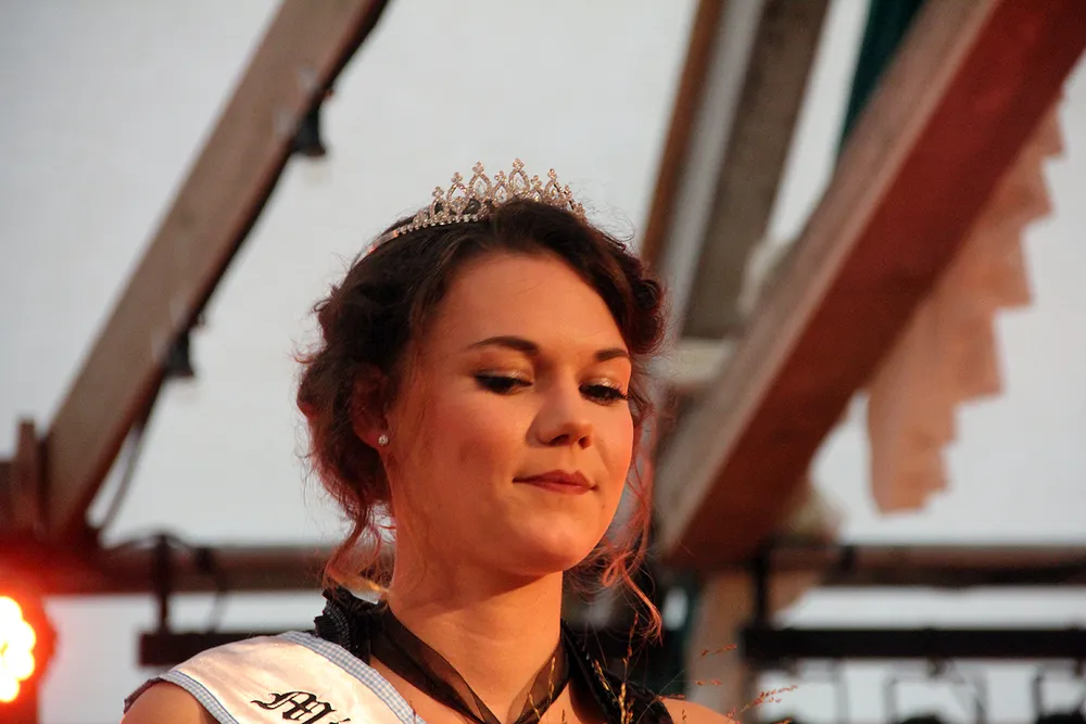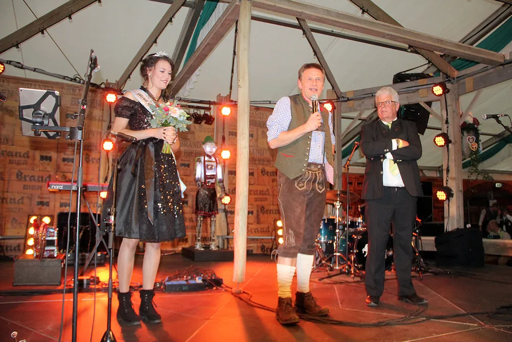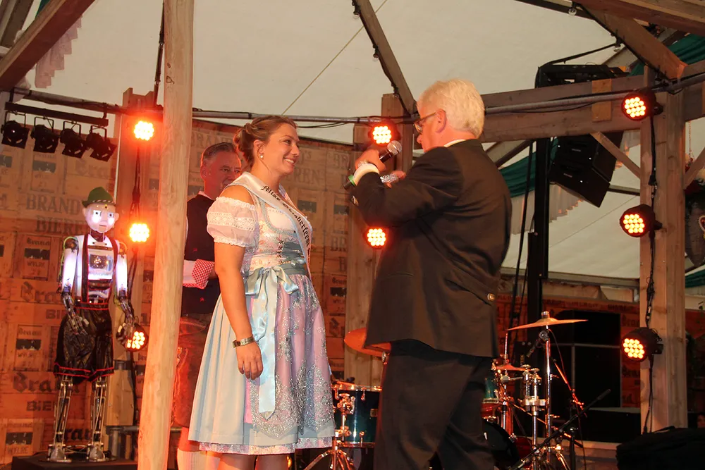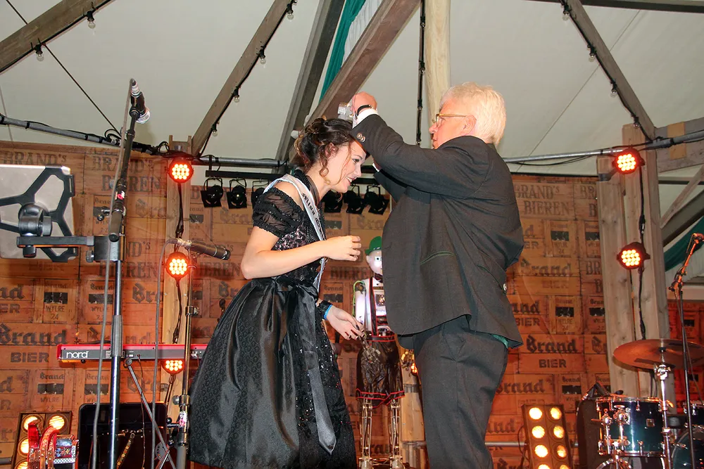 Allereerst ontdeed burgemeester Sjraar Cox Veerle's voorgangster Elise Schreuders van haar kroontje en sjerp. Elise dankte de organisatie hartelijk voor een onvergetelijk jaar en wenste haar opvolgster veel succes. Vervolgens kreeg Veerle haar Miss Oktoberfeestsjerp omgehangen en haar kroontje opgezet.