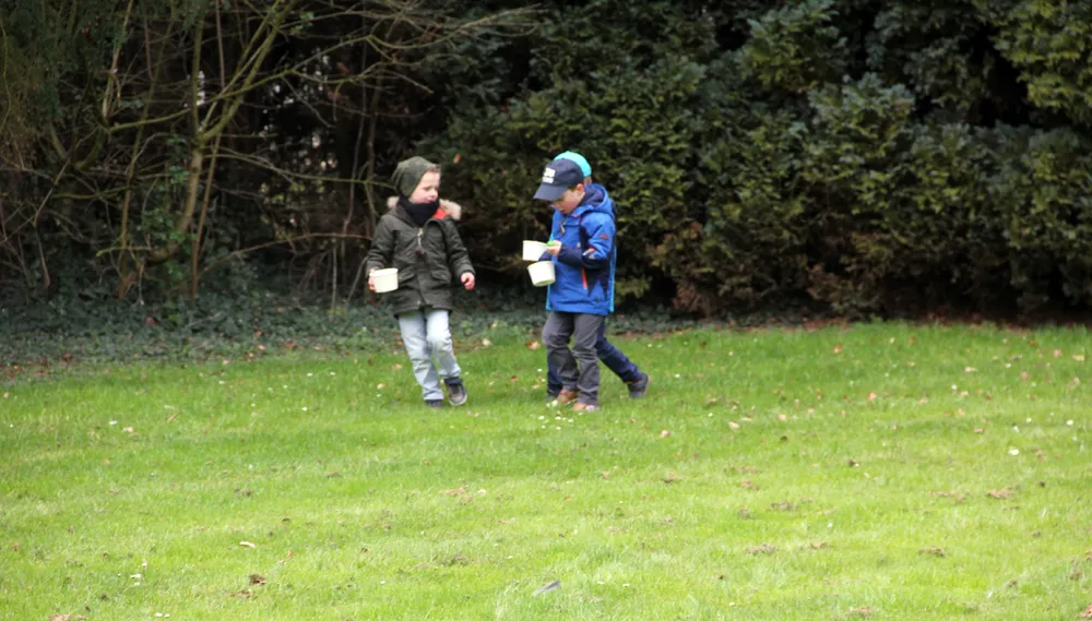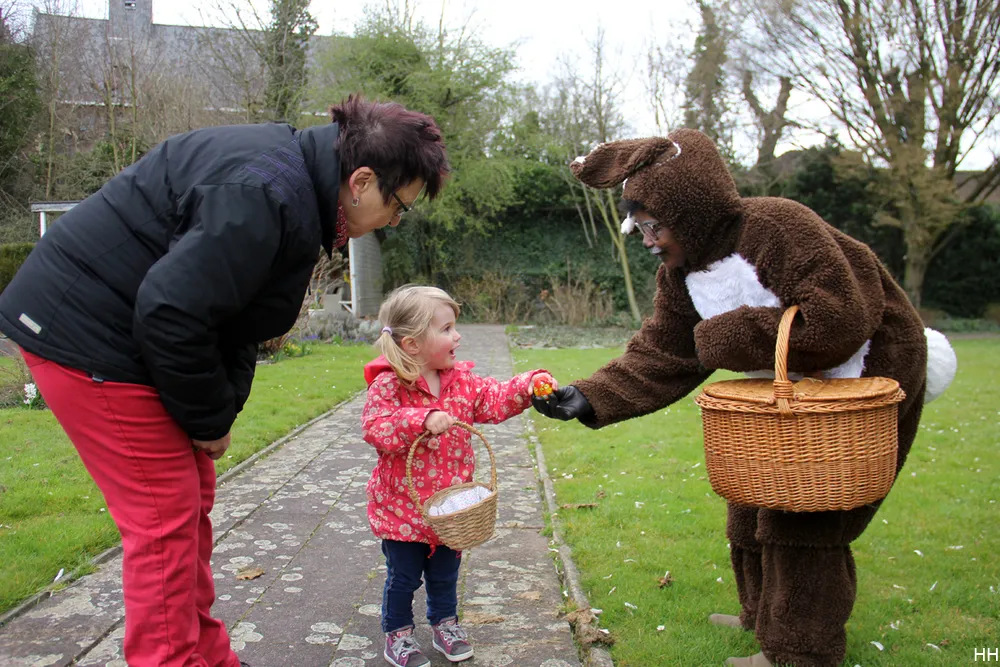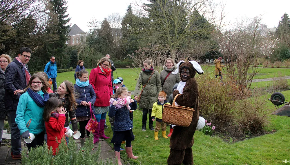 Om 12:00 uur huppelde de paashaas de redelijk beschutte kloostertuin van Agnetenberg binnen en zijn eiermandje was bijna leeg.