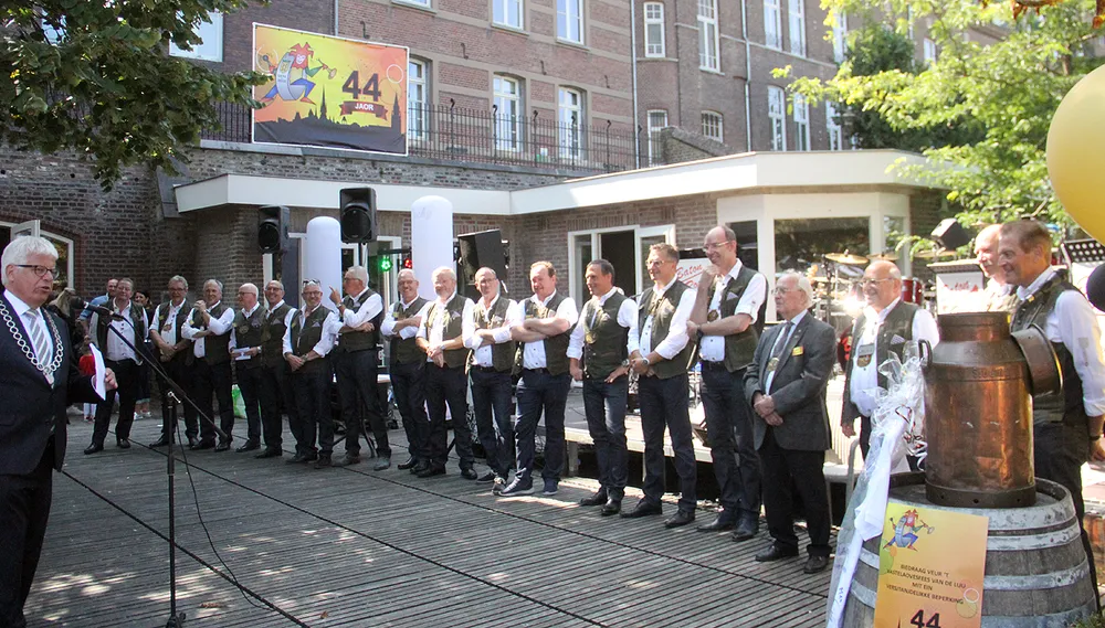 Burgemeester Sjraar Cox heeft zondag 19 augustus de Penning van Verdienste van de Gemeente Sittard-Geleen uitgereikt aan Sjtadskapel 't Trumke en 't Tröötje.
