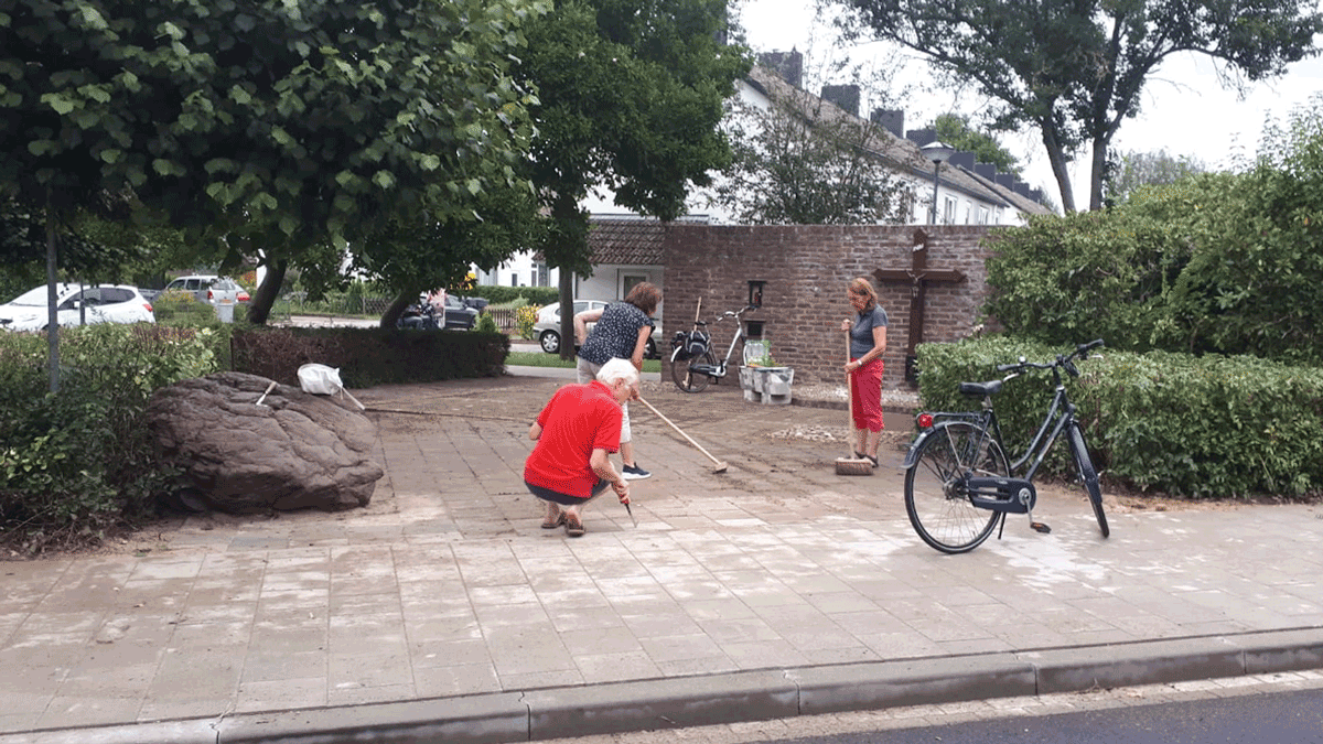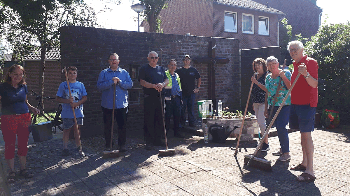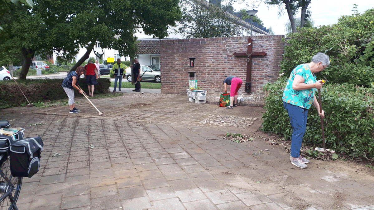 Vele vrijwilligers van de parochie en verenigingen uit de gemeenschap hebben de handen uit de mouwen gestoken. Er werd volop gesnoeid, onkruid tussen de tegels werd weggehaald en er werd afval opgeruimd en geveegd.