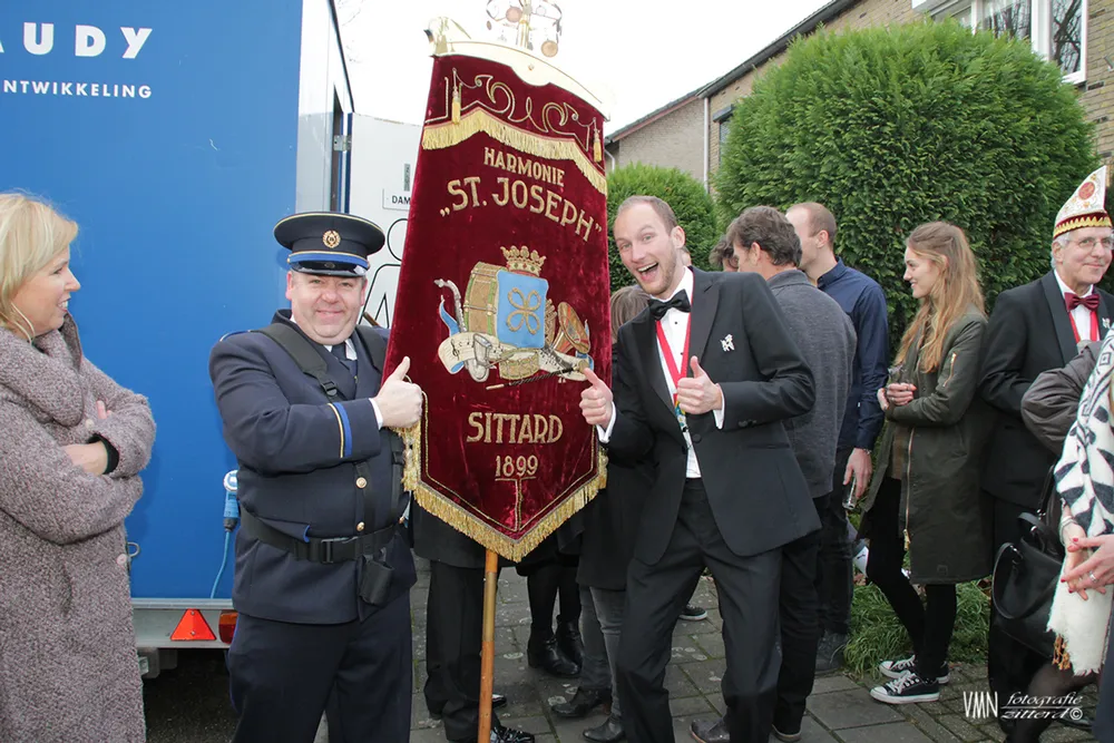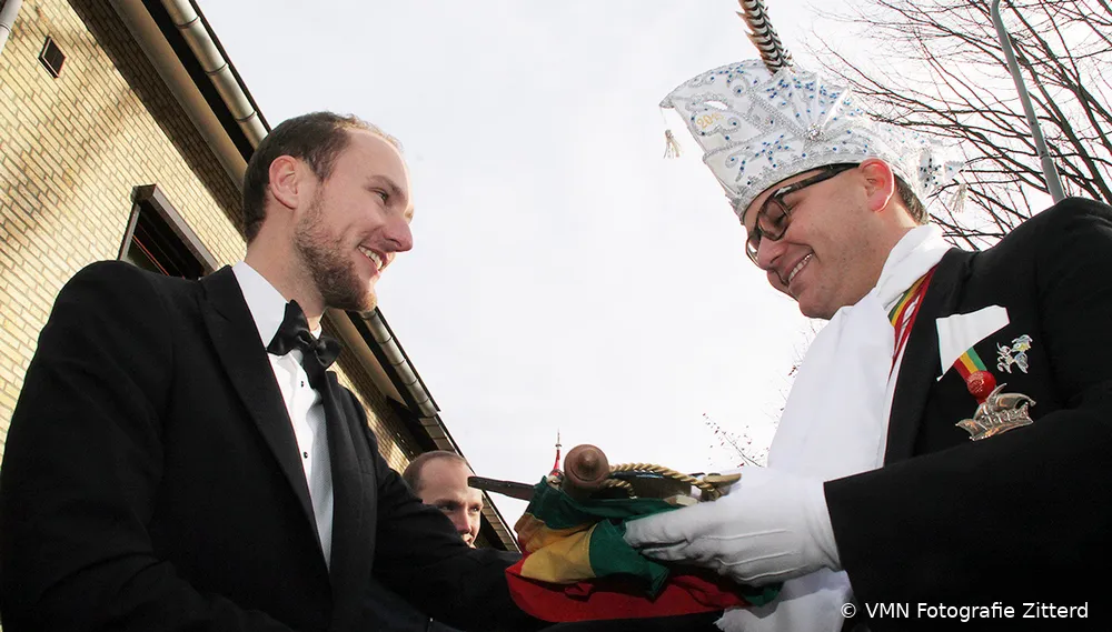 Prins Arno III overhandigde de rood-geel-groene prinsenwimpel die komend jaar achter het raam van het prinselijk paleis komt te hangen. De scepter, prinsenveren en andere onderscheidingen draagt hij nog tot zaterdag 16 januari, want dan wordt Sander van Goethem in Stadsschouwburg De Domijnen geïnstalleerd als nieuwe stadsprins van Sittard, prins Sander I.