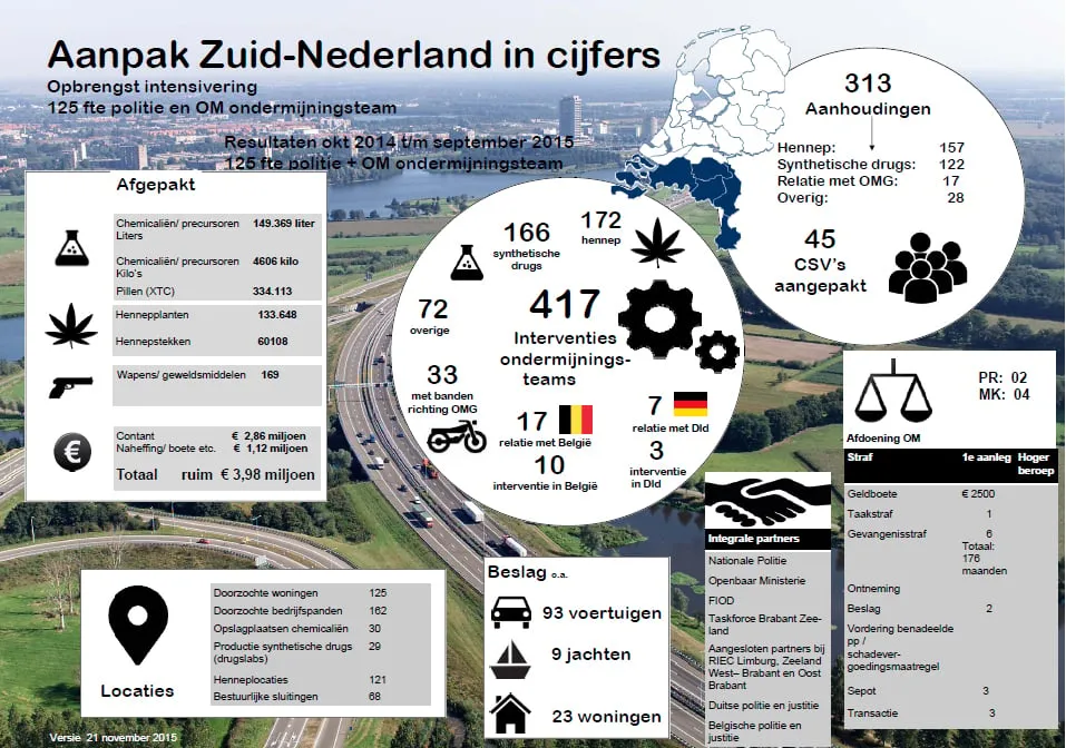 De politie heeft de balans opgemaakt van de resultaten van de sinds oktober 2014 geïntensiveerde aanpak van de ondermijnende drugscriminaliteit in Zuid-Nederland.