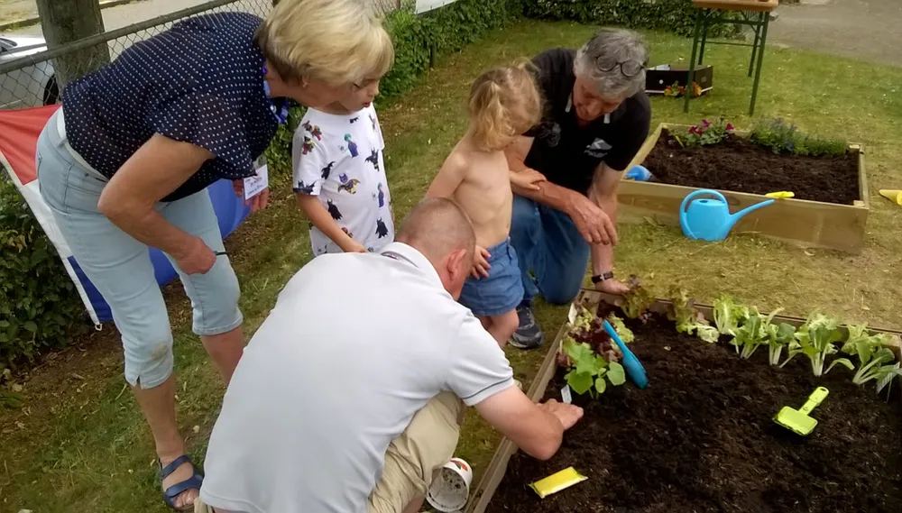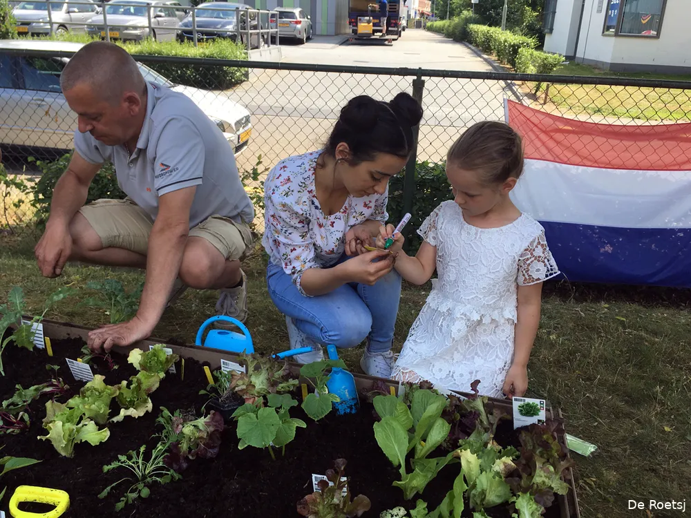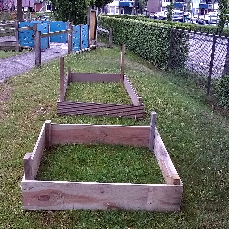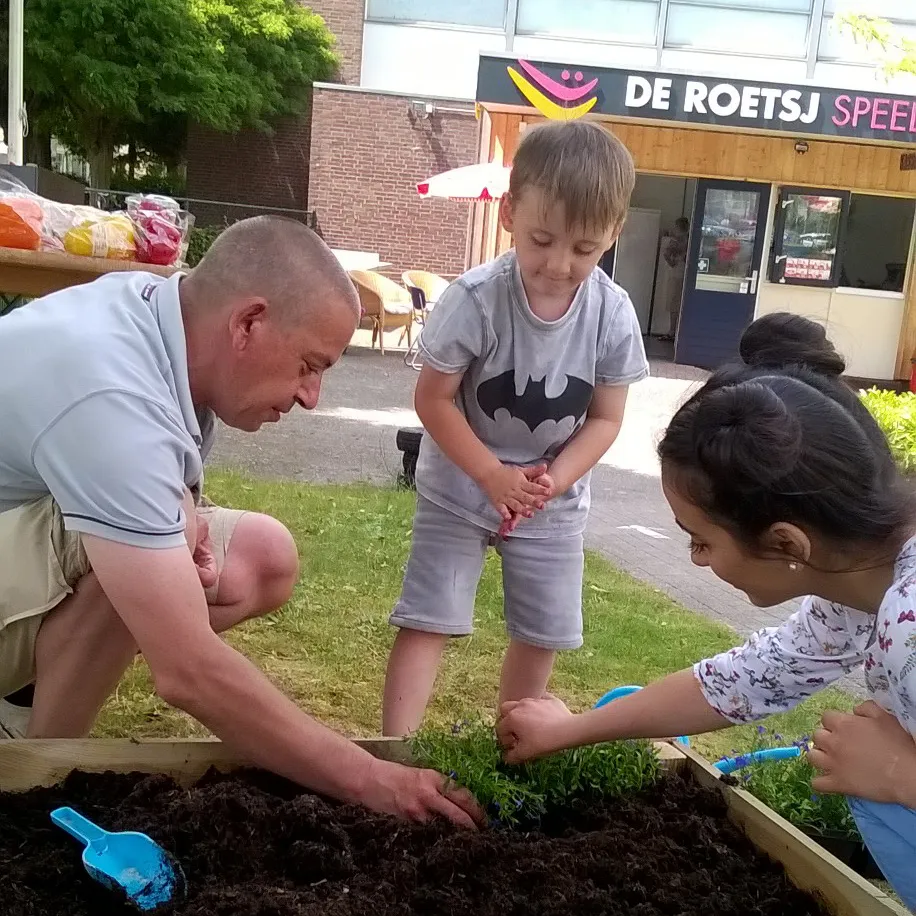 Afgelopen week werd in de speeltuin een bak geplaatst met aarde. Nadat de kinderen eerst konden proeven van tomaten, aardbeien, paprika, radijs, sla en komkommer werd de bak met deze groenten beplant. Ook is er plek voor bloemzaadjes in een kleinere bak, waar ook de zelf meegebrachte plantjes in komen te staan en waarin kinderen van de naast de speeltuin gelegen peuterspeelzaal bloemenzaadjes zaaien. De kinderen gaan ook meehelpen met het onderhoud van de miniatuurtuintjes.