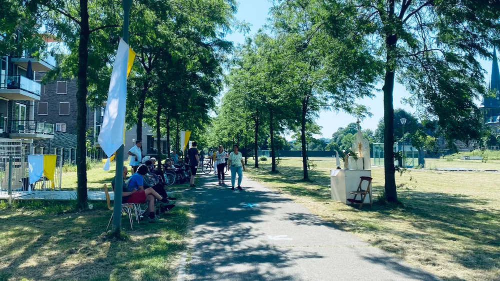Sinds enkele jaren volgt de Sacramentsprocessie in Sittard een vaste route in het centrum van de stad: via Kerkplein en Begijnenhofstraat gaat de stoet over de schootsvelden richting Hof van Serviam, waar bij een klein rustaltaar kort wordt haltgehouden. De schaduwrijke grasstrook langs het Langk Getske was al ruim voordat de processie arriveerde ingenomen door tientallen bejaarde bewoners van de Hof van Serviam.